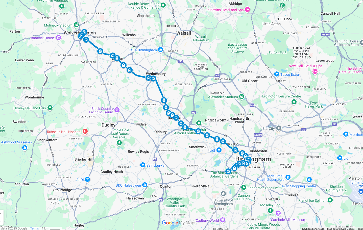 Wolverhampton is also served by the West Midlands Metro, which connects directly to the centre of Birmingham. Trams run every 10-12 minutes Monday to Saturday daytimes and every 15 minutes during the evenings and on Sundays. The Metro network has 5 ‘Park & Ride’ sites with free parking - you just pay for your tram ticket! Off-peak day tickets can be purchased for £5.40 per person on the tram. All West Midlands Metro trams have low floors and two dedicated wheelchair spaces on each vehicle. Each station is fully accessible and has multiple access facilities.