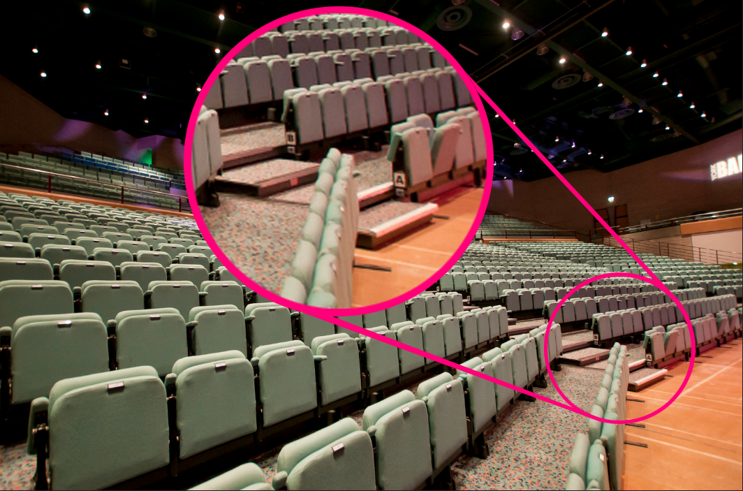AA and BB seats fold down and are not fixed to the floor. Individual seats at the end of rows are removed to allow wheelchairs to wheel in.