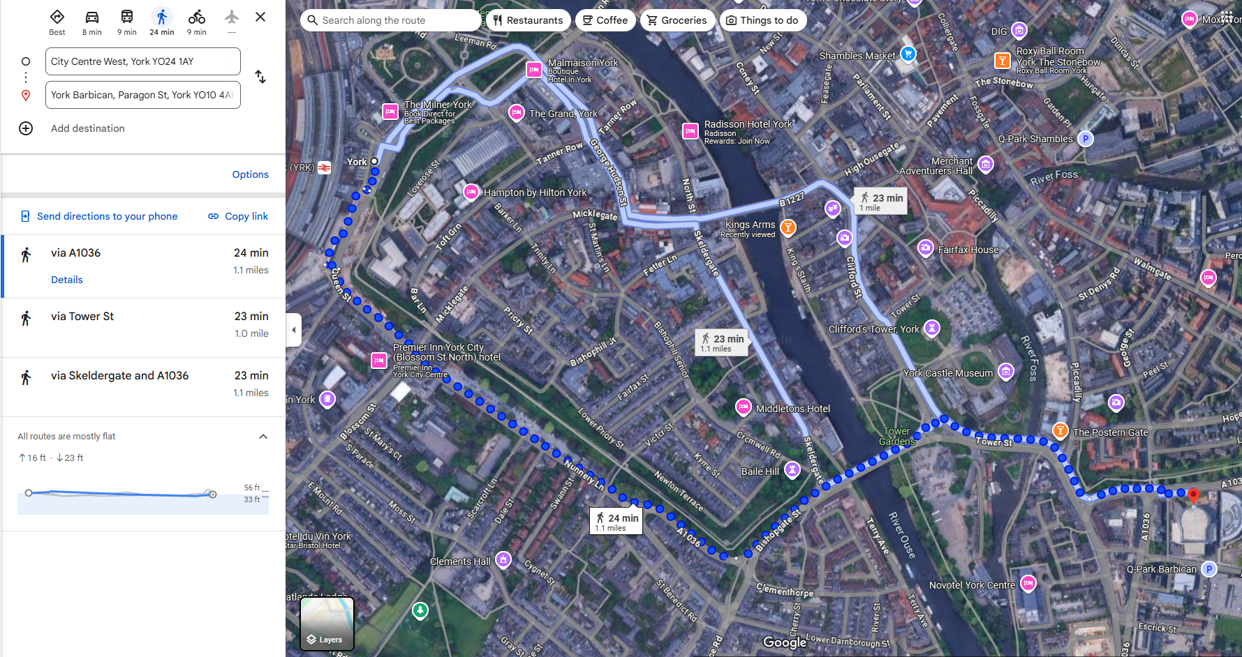 When visiting the Barbican, I usually try to park at Castle Car Park at the foot of Clifford’s Tower. The park has 30 accessible bays, but it gets swamped as it’s close to several tourist attractions and a short distance from the city’s centre. The St. George’s Playing Field car park is closer to the Barbican, but this park only has six accessible bays. It’s also further from the city centre if you plan on going for something to eat or shop.