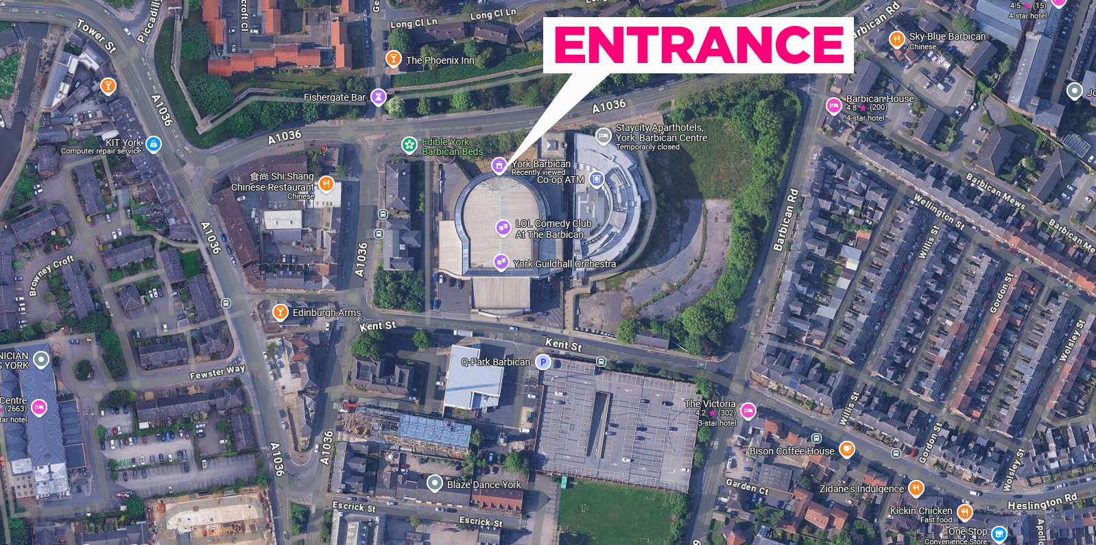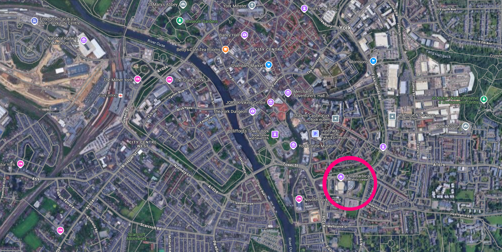 The Barbican is in the city of York, just outside the city walls and only a short distance from the banks of the River Ouse.