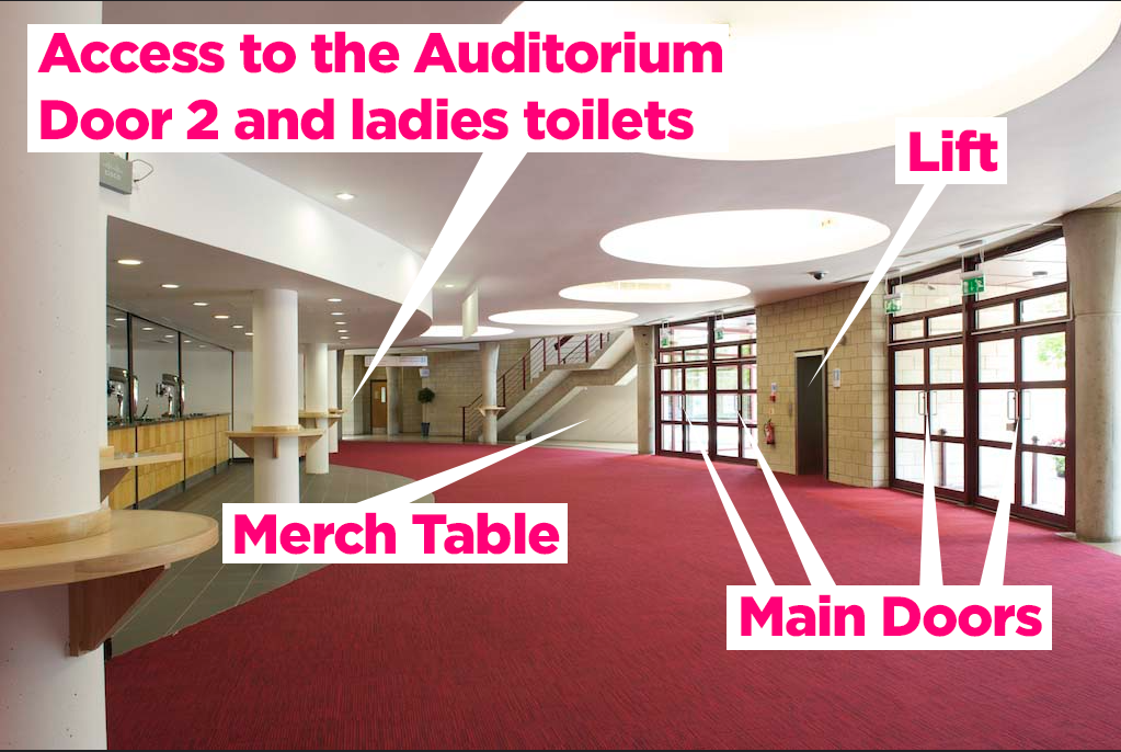 Directly opposite the main doors is the bar. The merch desk is opposite the bar, backing onto the piazza and tucked under the stairs. Following the wall line from each side of the bar, you’ll come to the ladies’ toilets on the right, the accessible toilet and the gents on the left. Moving further out to the extremities of the foyer, a corridor at each end leads into the auditorium.