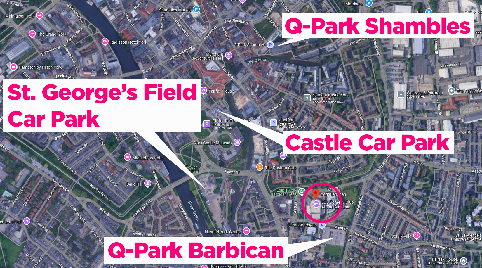 Q Park has 2 locations in York - Barbican and Shambles, just 1 and 7 minutes’ walk or roll from the Barbican. Collectively, the two parks only have seven accessible bays. The parks are both open 24/7 and charges start at £2.00 per hour.