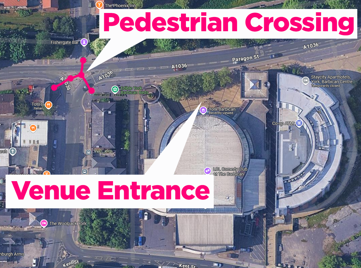 The roads around the venue get very busy, but there are three pedestrian crossings not far from the entrance to get you across the road safely.