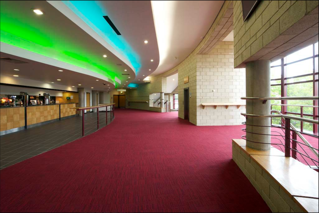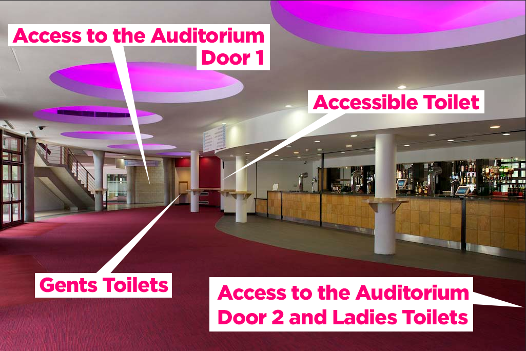 The accessible toilet in the foyer does not require a radar key and doubles up as a baby changing facility. The placement is convenient if you are sitting on the left-hand side of the auditorium, as you only have to wheel out into the foyer and you’re there. If you are seated at the opposite side of the auditorium, you either need to wheel right along the front of the stage and out into the foyer near the toilet or out into your side of the foyer, then right across the foyer to the toilet.
