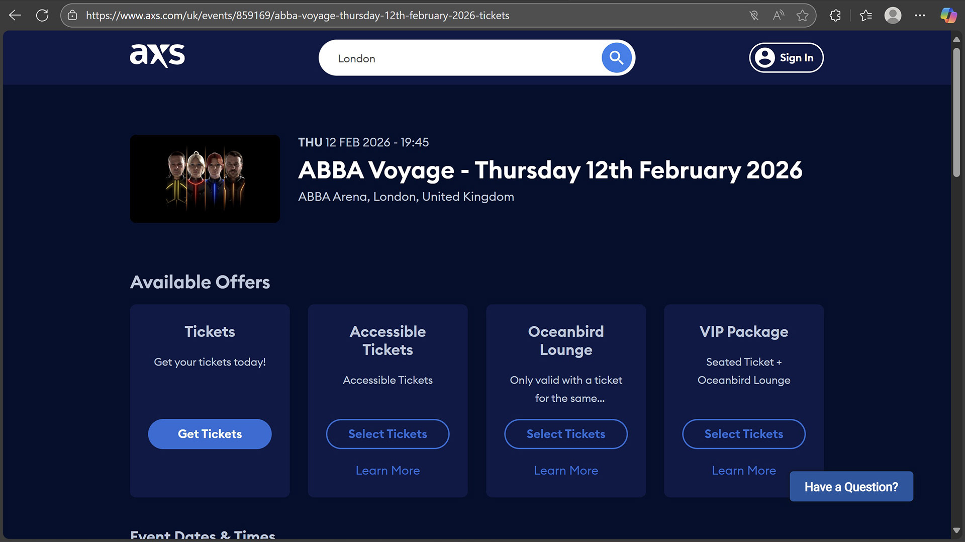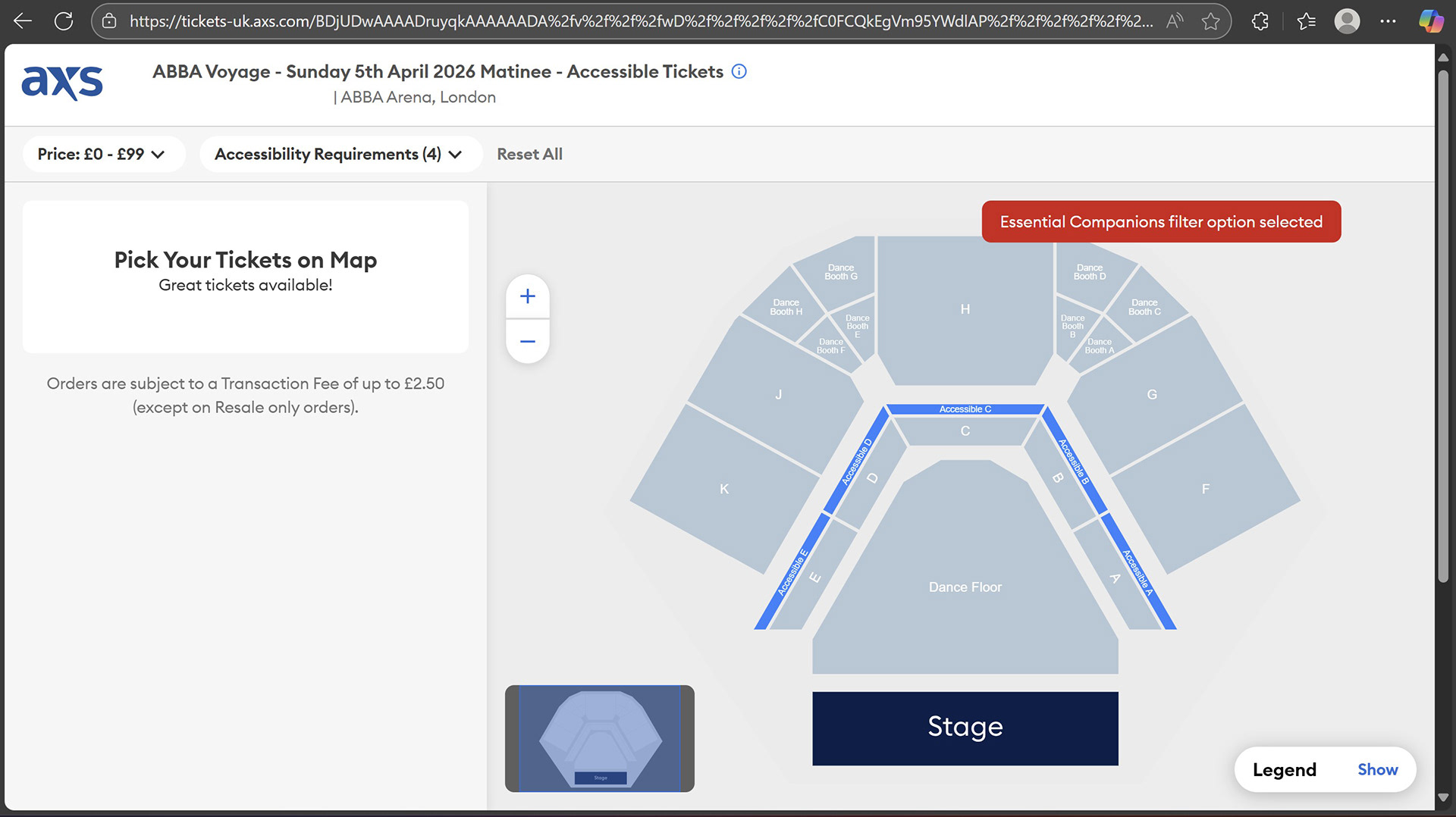 Accessible tickets are purchased directly with the ABBA Arena via the AXS ticketing system.