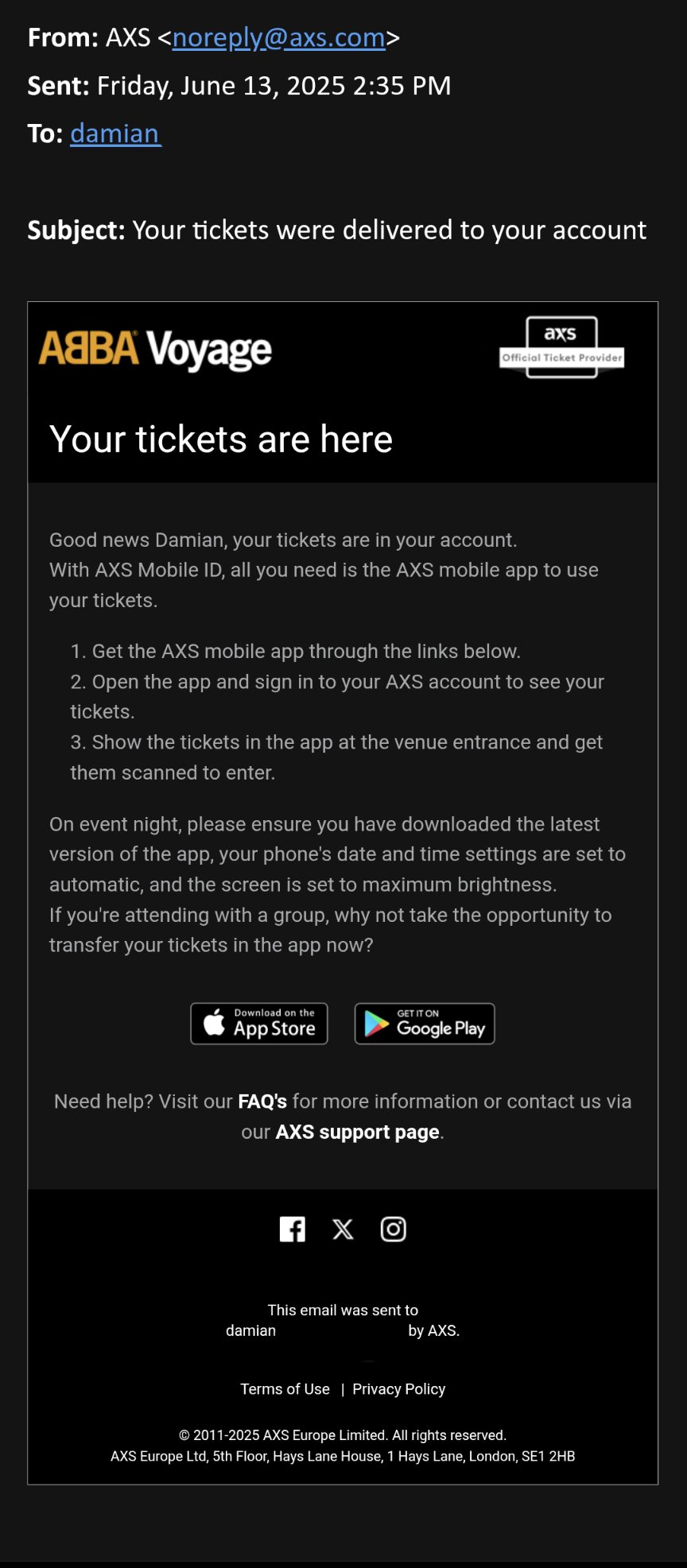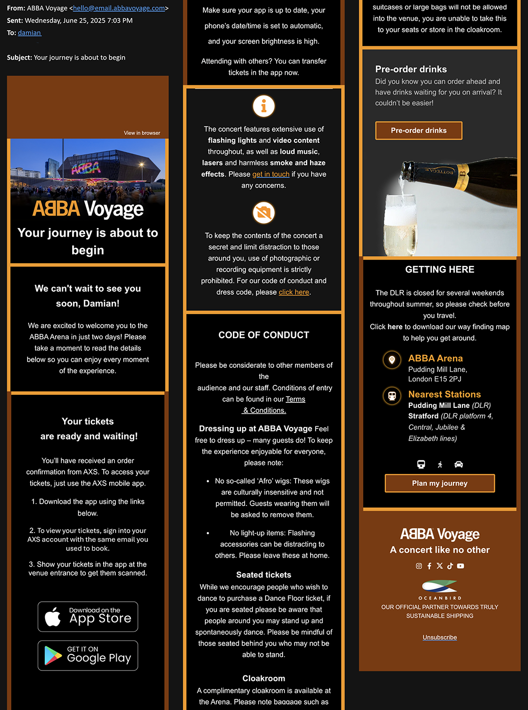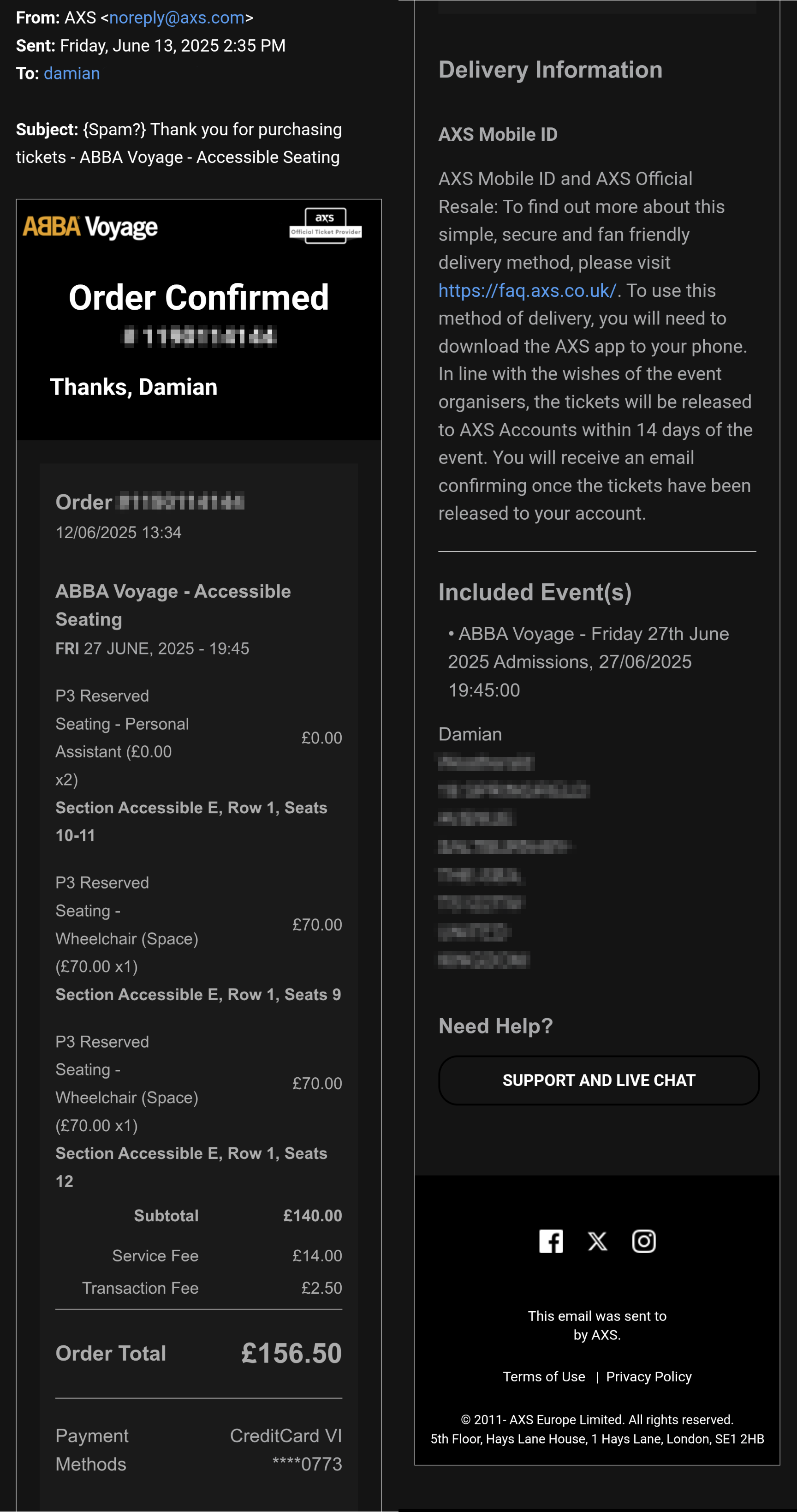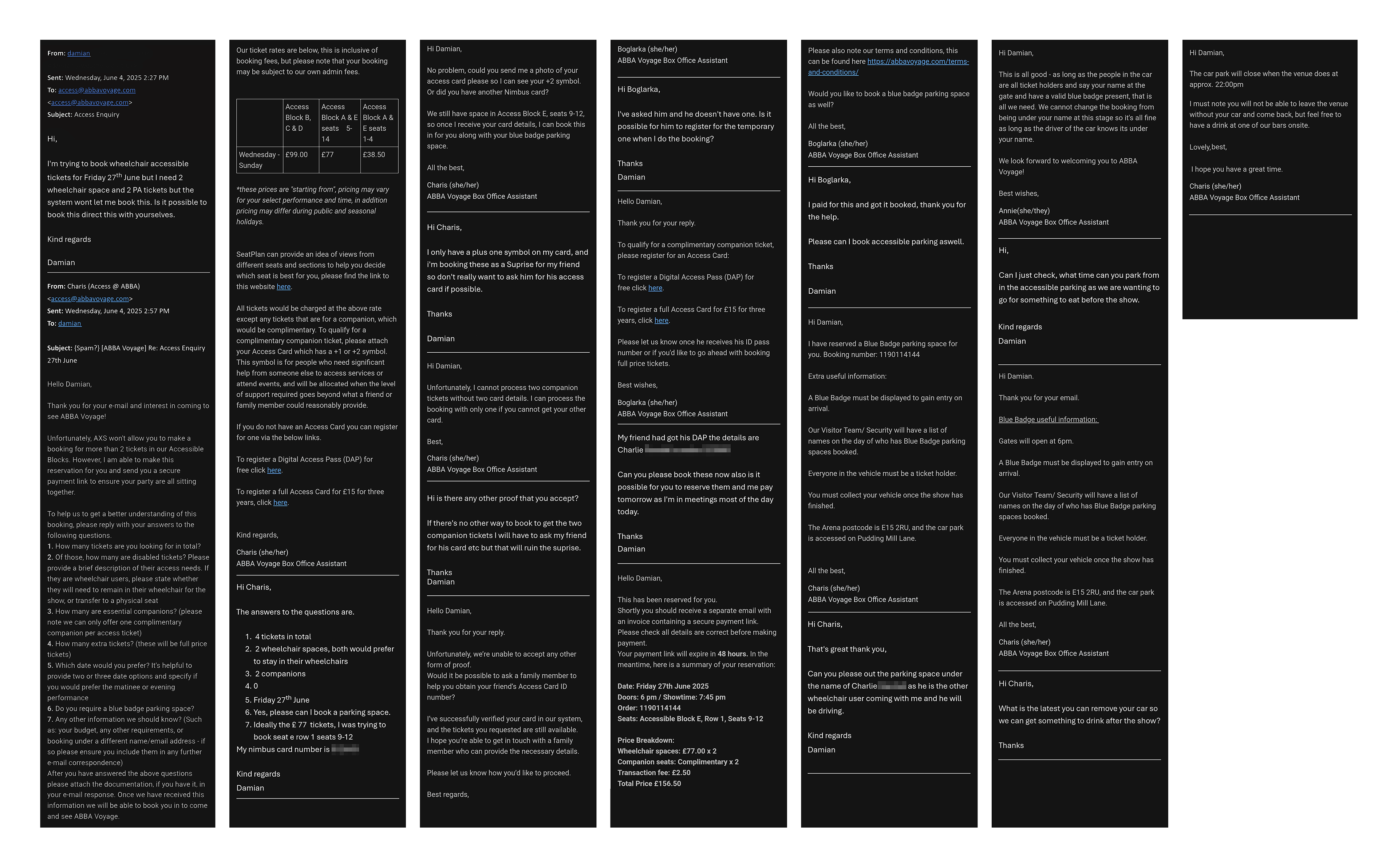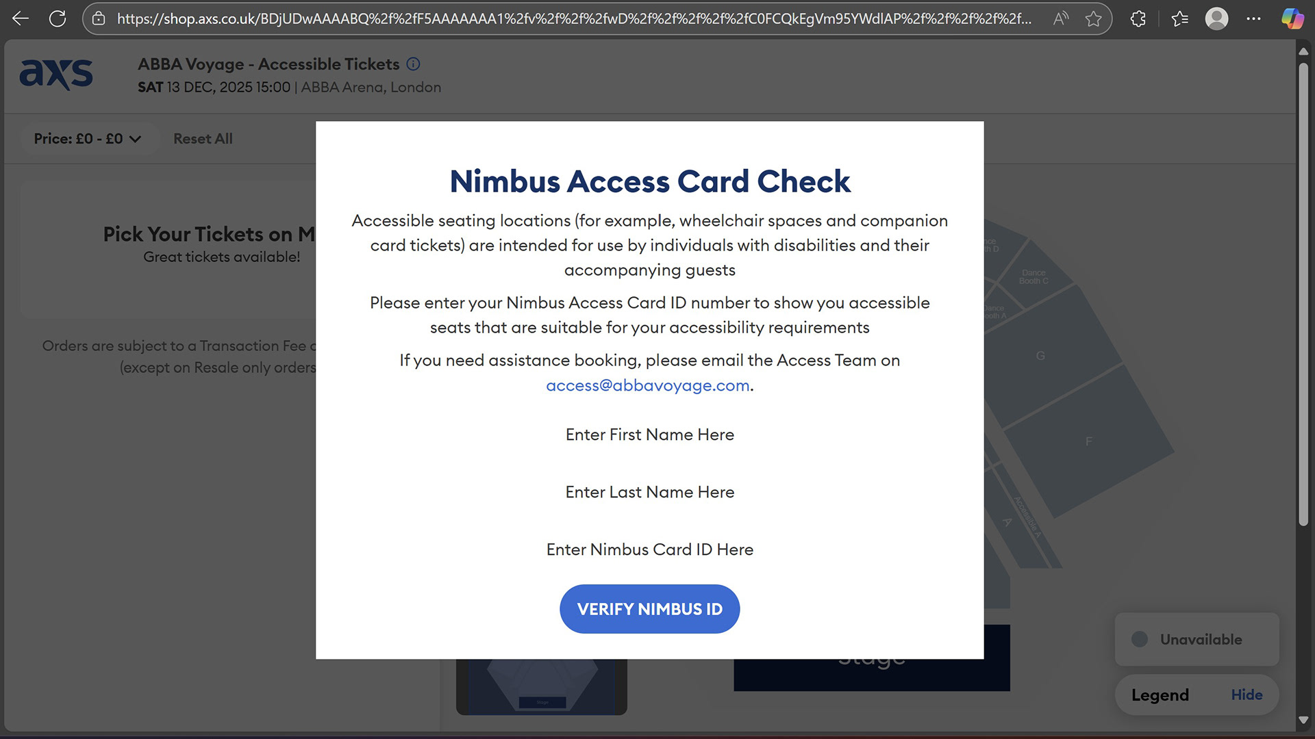 I sent an email to access@abbavoyage.com to inquire about booking for four of us. They said it wasn’t possible to do online, but it could be arranged with the access team. The snag? Both wheelchair users have to provide Nimbus card details, and only one of us had one. I asked if they would accept any other proof of disability - no, they won’t. If you don’t want to sign up for a Nimbus card, which costs £15 and is valid for 3 years, you can opt for a Digital Access Pass (DAP), which functions similarly to the Nimbus card but is only valid for bookings with a single venue. Charlie, my wheelchair-using friend who was coming to the show with us, had to sign up for a DAP, so I could pass the number on to the access team to make the booking.