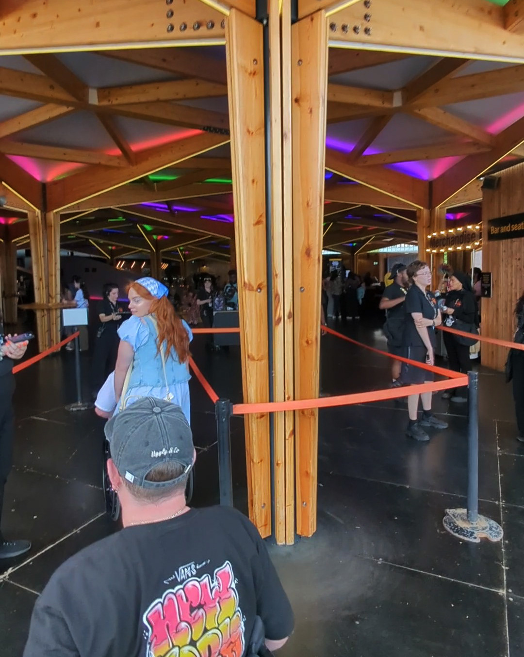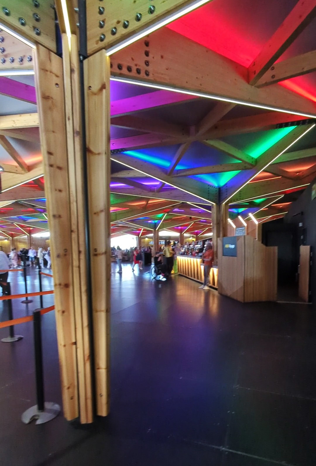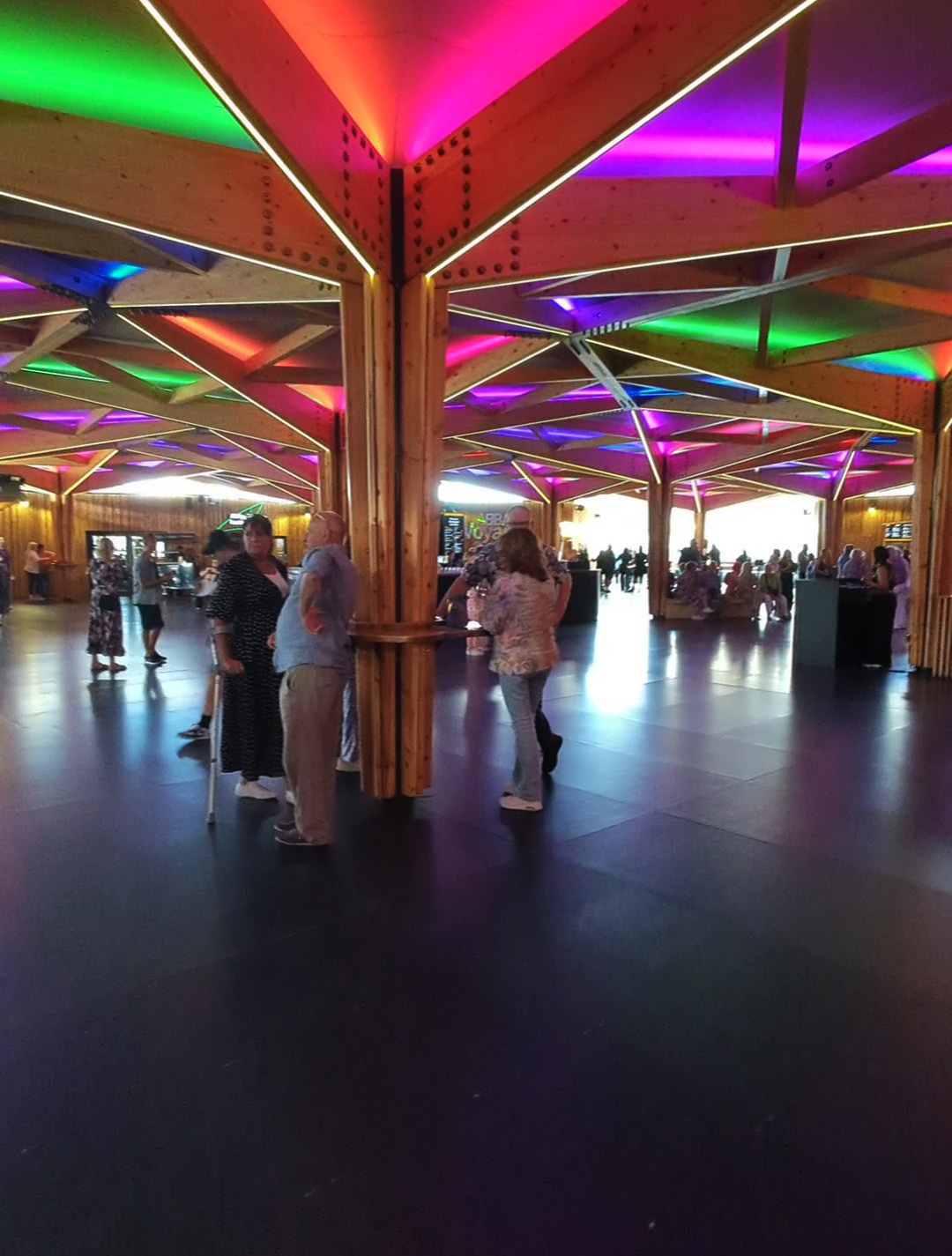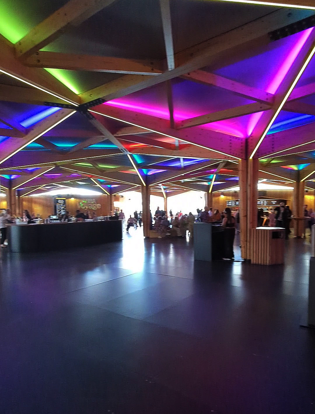 I call it a concourse area as I don’t really know how else to describe it. You’re undercover, but the area isn’t fully enclosed. I suppose it’s a bit like a semi-circular gazebo with open doorways at the entrances. The roof is constructed from wood in geometric shapes with coloured neon lights illuminating it, and has wooden pillars to support it. Again, the flooring is smooth, and there are bars and food outlets around.