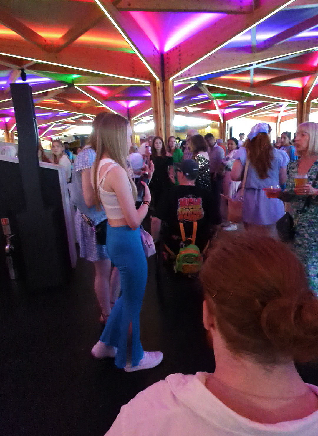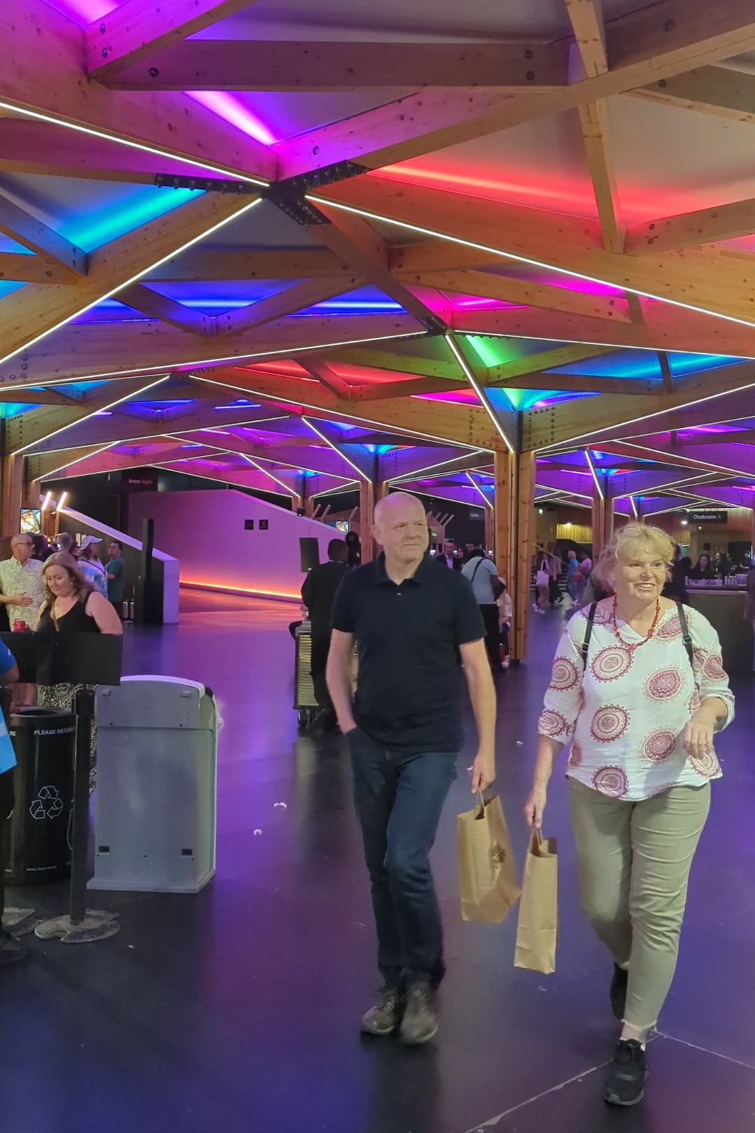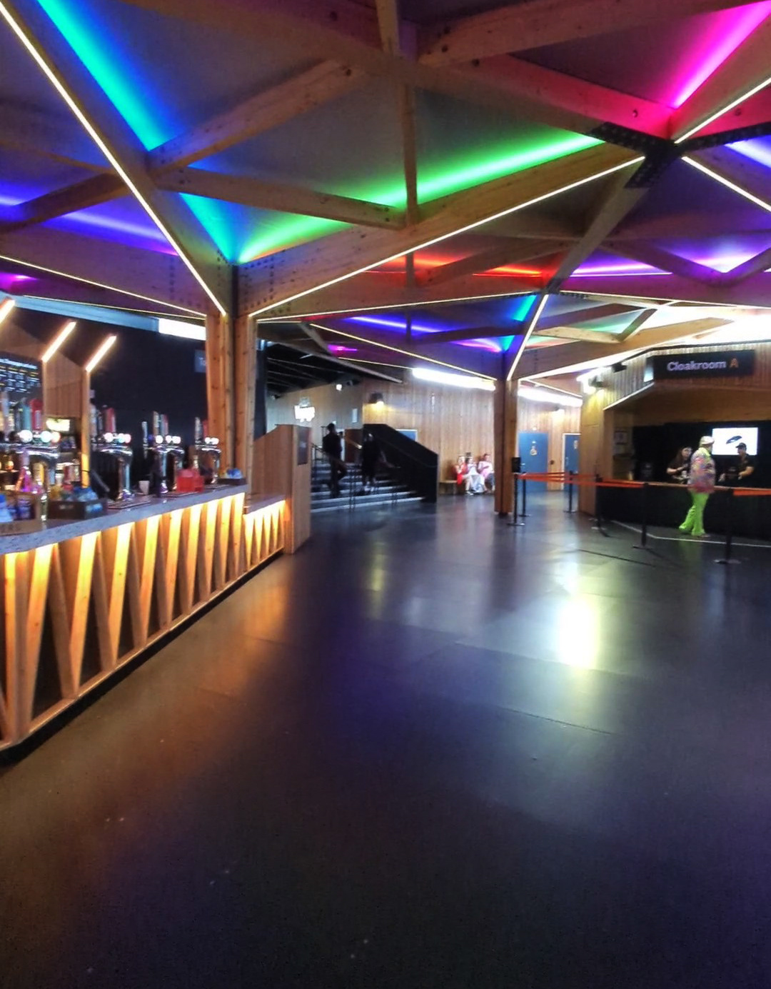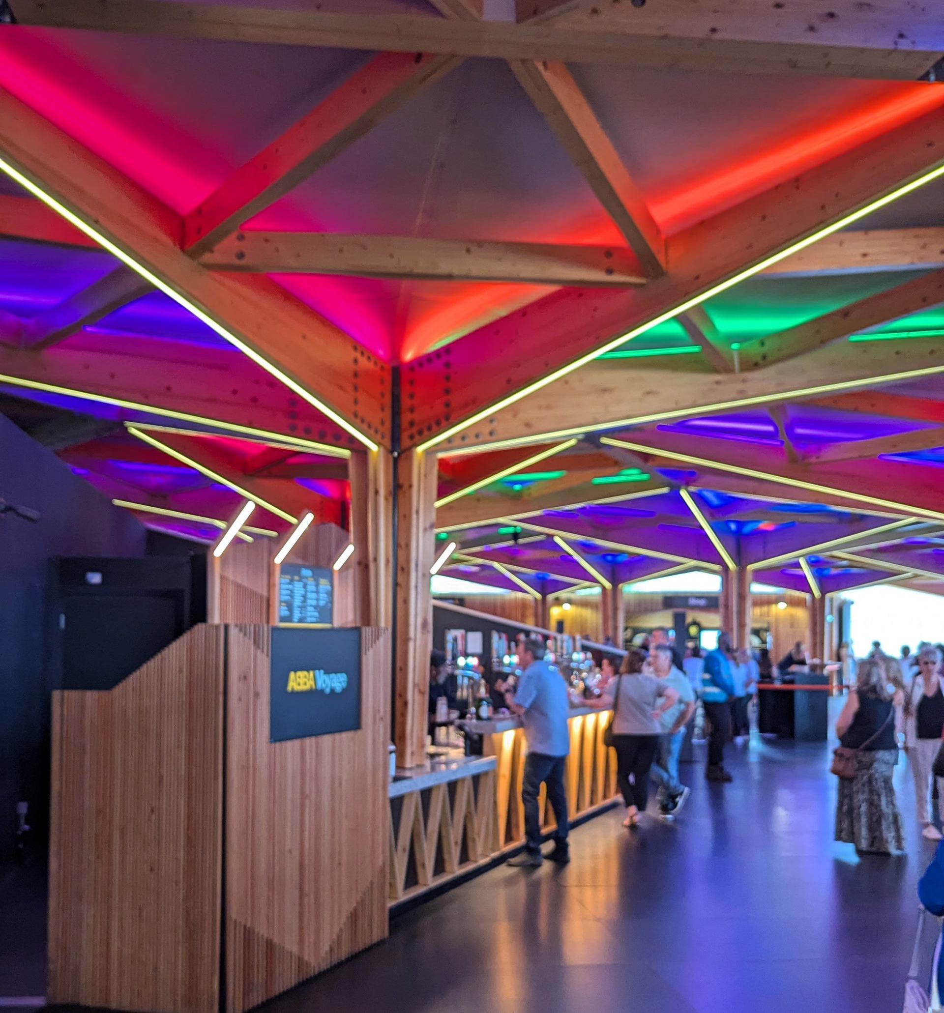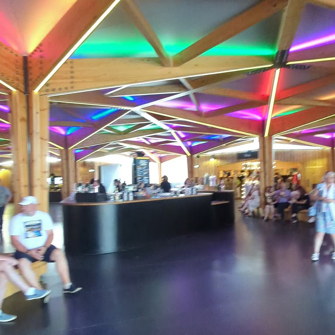 I call it a concourse area as I don’t really know how else to describe it. You’re undercover, but the area isn’t fully enclosed. I suppose it’s a bit like a semi-circular gazebo with open doorways at the entrances. The roof is constructed from wood in geometric shapes with coloured neon lights illuminating it, and has wooden pillars to support it. Again, the flooring is smooth, and there are bars and food outlets around.