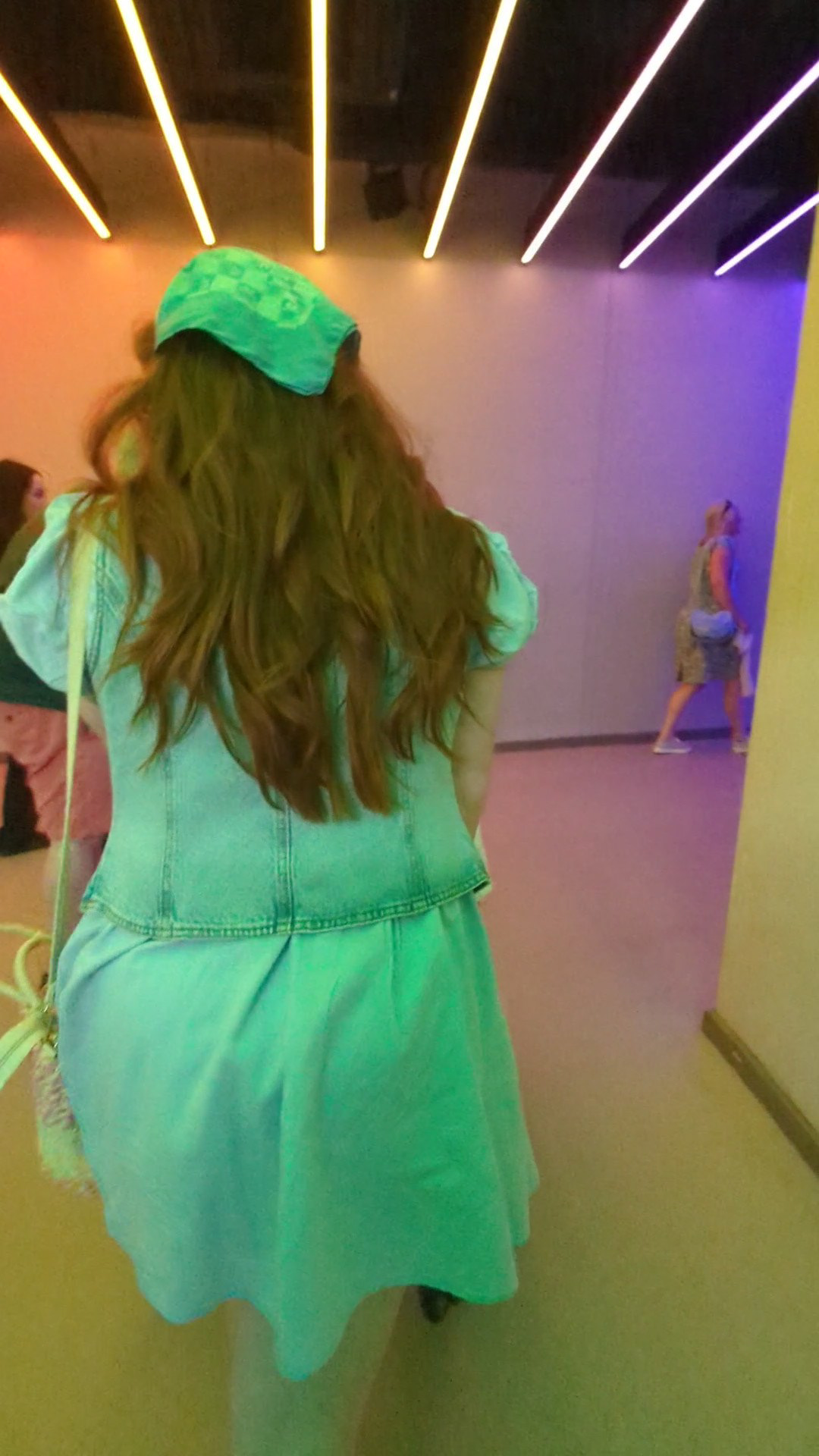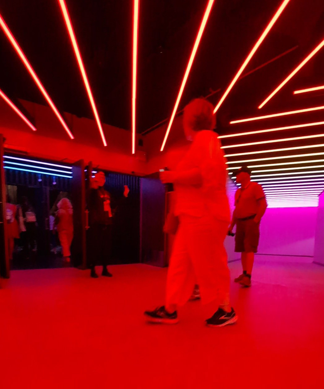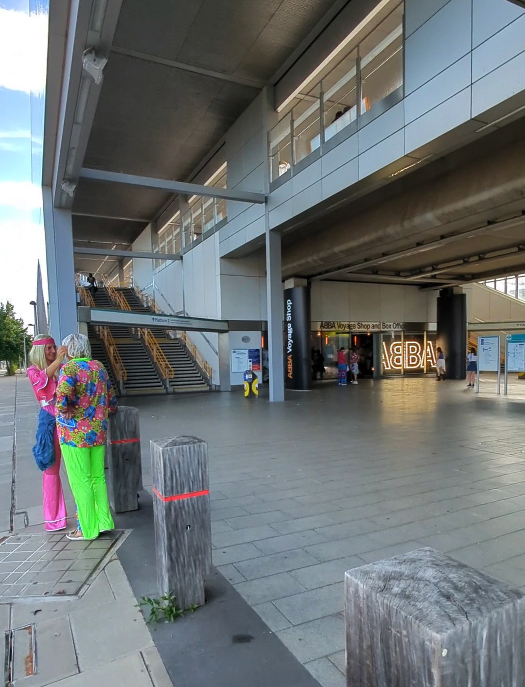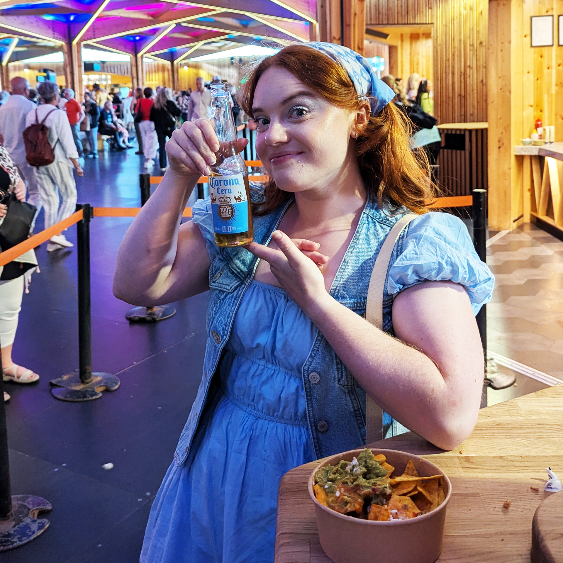 I call it a concourse area as I don’t really know how else to describe it. You’re undercover, but the area isn’t fully enclosed. I suppose it’s a bit like a semi-circular gazebo with open doorways at the entrances. The roof is constructed from wood in geometric shapes with coloured neon lights illuminating it, and has wooden pillars to support it. Again, the flooring is smooth, and there are bars and food outlets around.