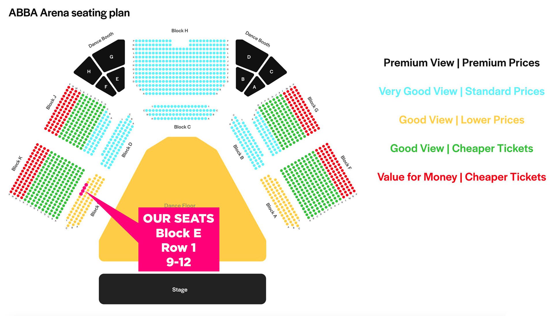 Our seats were in Row 1, seats 9, 10, 11, and 12 in Block E.