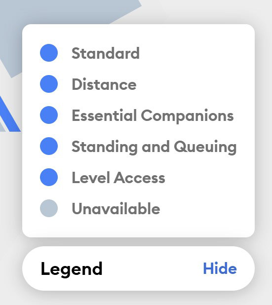 When your details are submitted, you will see a map with the options suitable for you. The legend will be displayed at the bottom right-hand corner of the page, showing which options are selected from your Nimbus card symbols. You can then click on the map on screen to choose your preferred seats. Wheelchair and step-free seating options are available around the arena in row 1. Seating options for individuals with hearing or visual impairments will be displayed if you have the relevant symbols on your card.