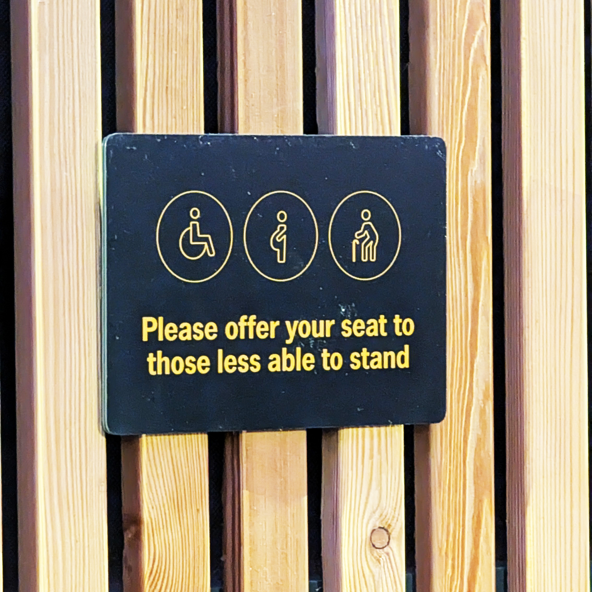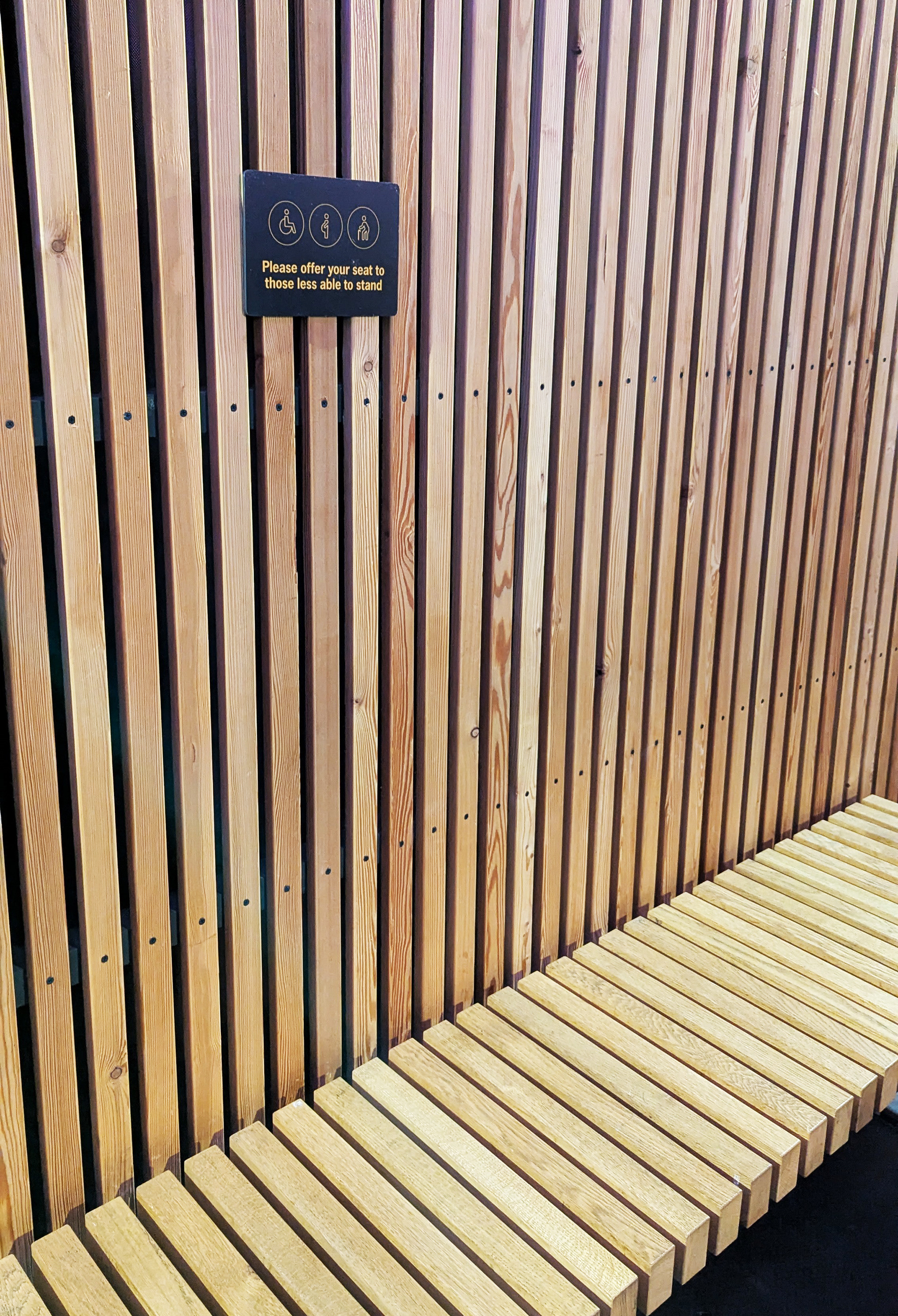 There is a limited amount of seating around the concourse, with signage requesting that seating be offered to those who are less able to stand. There is also a limited number of surfaces available for placing food and drinks. There are no tables.