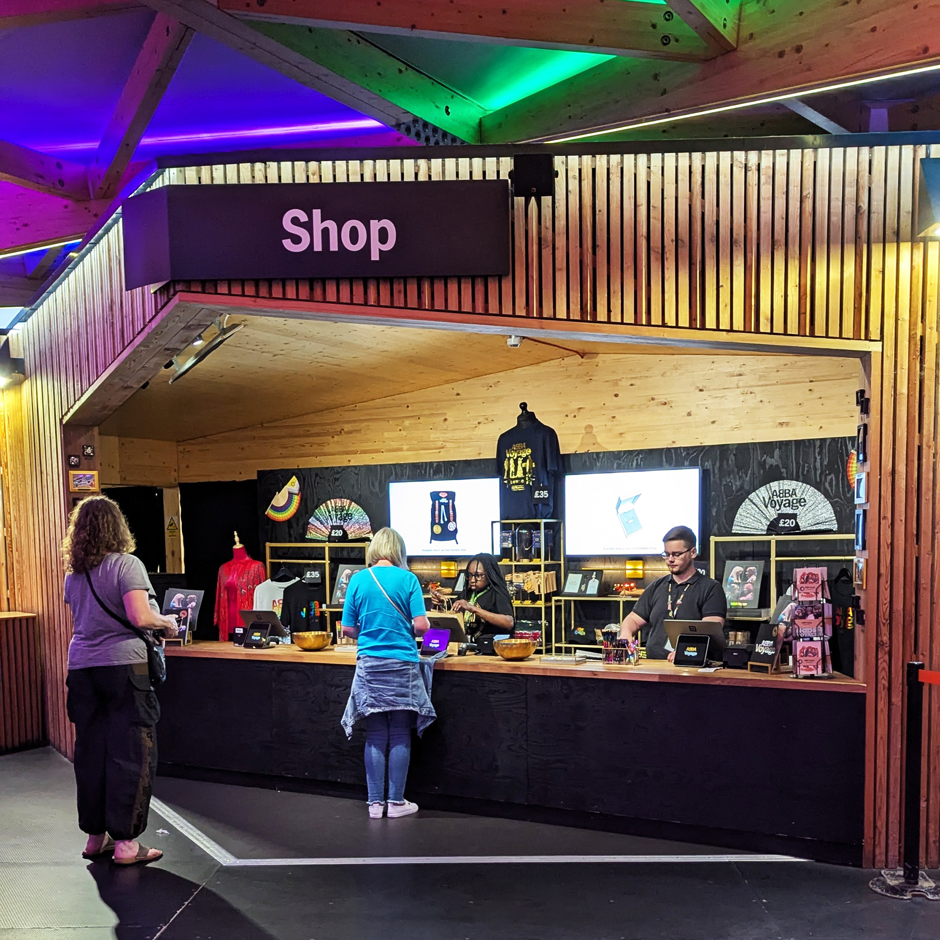 The Box Office and gift shop are located at ground level below the DLR station. Outside the front of the arena, a small merchandise cart sells some of the smaller items from the gift shop.