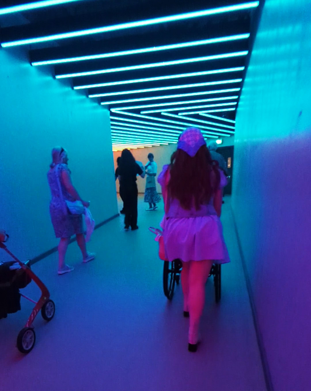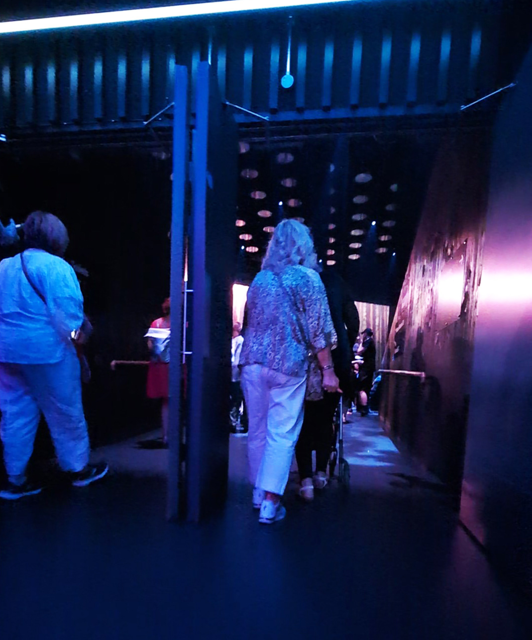 The white flooring slopes upward and leads to a corridor with white walls, the ceiling again illuminated by neon lights. We were shown through the right-hand door, where the corridor turned around to the right. Further along, there was a door to the toilets on the right, before the corridor turned left. You now approach two sets of double doors, propped open, that lead into the performance space, with a metal handrail running along between them.