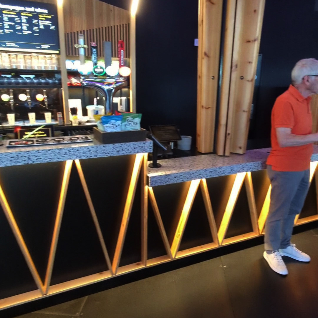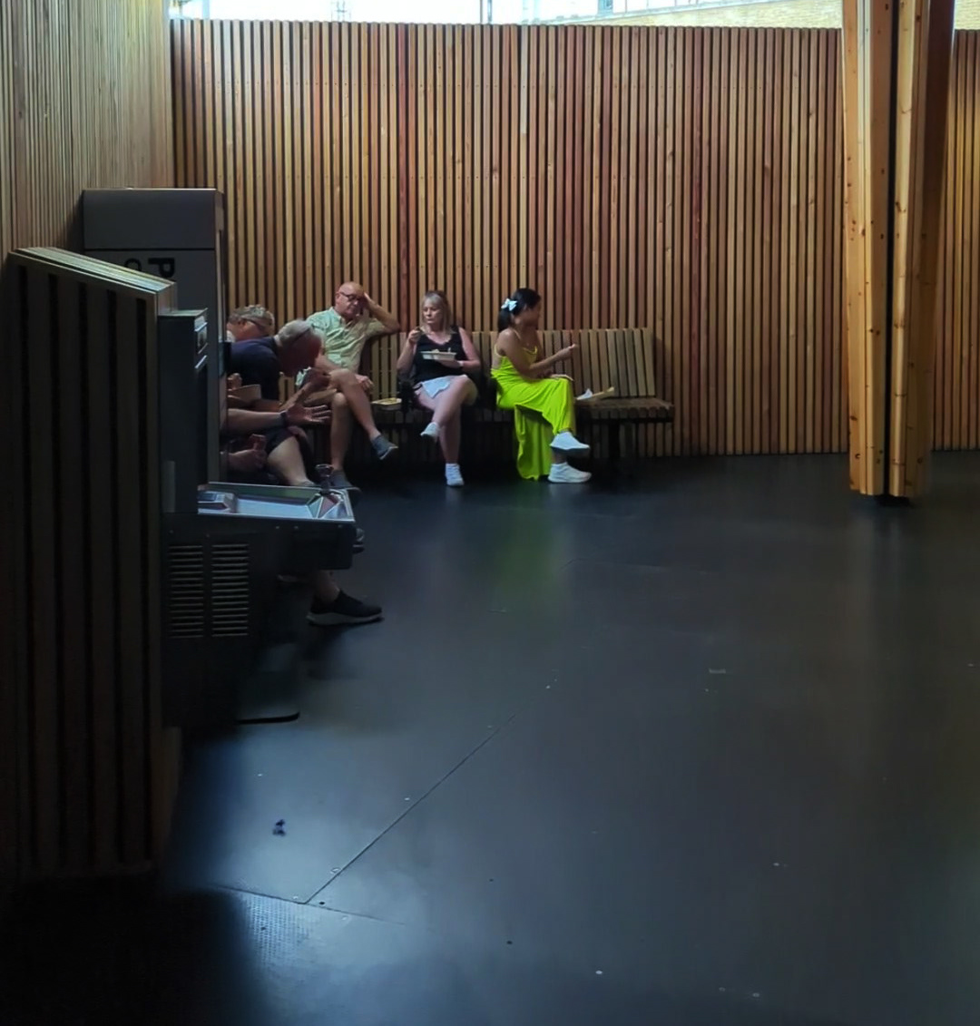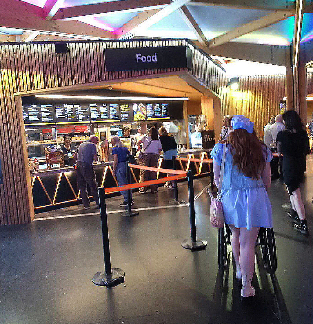 A member of the access team greeted us and checked where we were sitting. She explained that the doors into the performance space were not yet open. She showed us where the door to the performance space was and said she would meet us there at 6.45pm and get us in before the main rush. For now, we were free to move around the concourse area and get food and drinks.