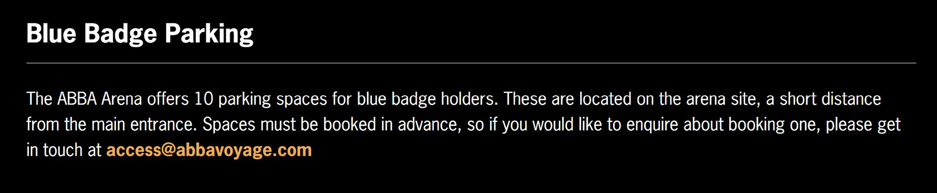 If you prefer to drive to the arena, there is Blue Badge parking onsite. The car parking is staffed and behind a secure gate. Once I had arranged to book my tickets with the access team, I requested a Blue Badge parking space. My name was added to the parking list for the evening of the show, at no additional charge, and I was given a booking reference number. It was a matter of providing my name and showing a valid Blue Badge at the parking gate upon arrival.