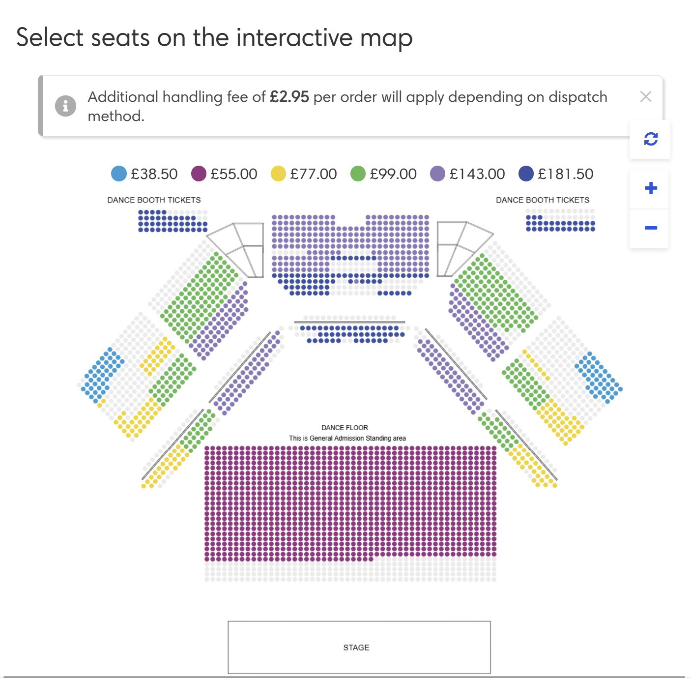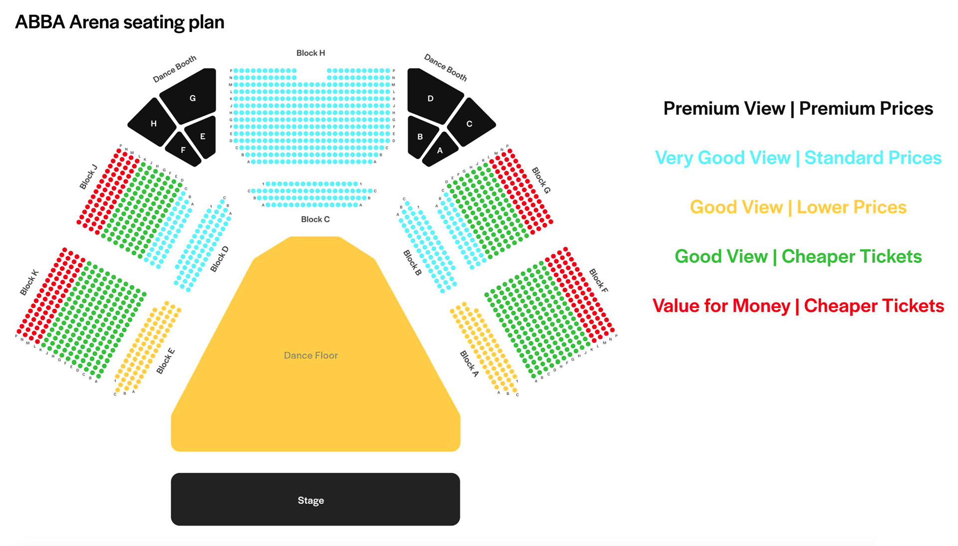 General tickets for the ABBA Arena can be purchased from several outlets, including websites that specialise in tickets for London theatre shows. The auditorium is designed to accommodate 1,650 seats and has space for a standing audience of 1,350. There is a large dance floor with three rows of seating surrounding it, with an additional step-free row for access customers. There are also stepped seating rows that encircle the arena, as well as eight dance booths accommodating groups of up to 12 people.