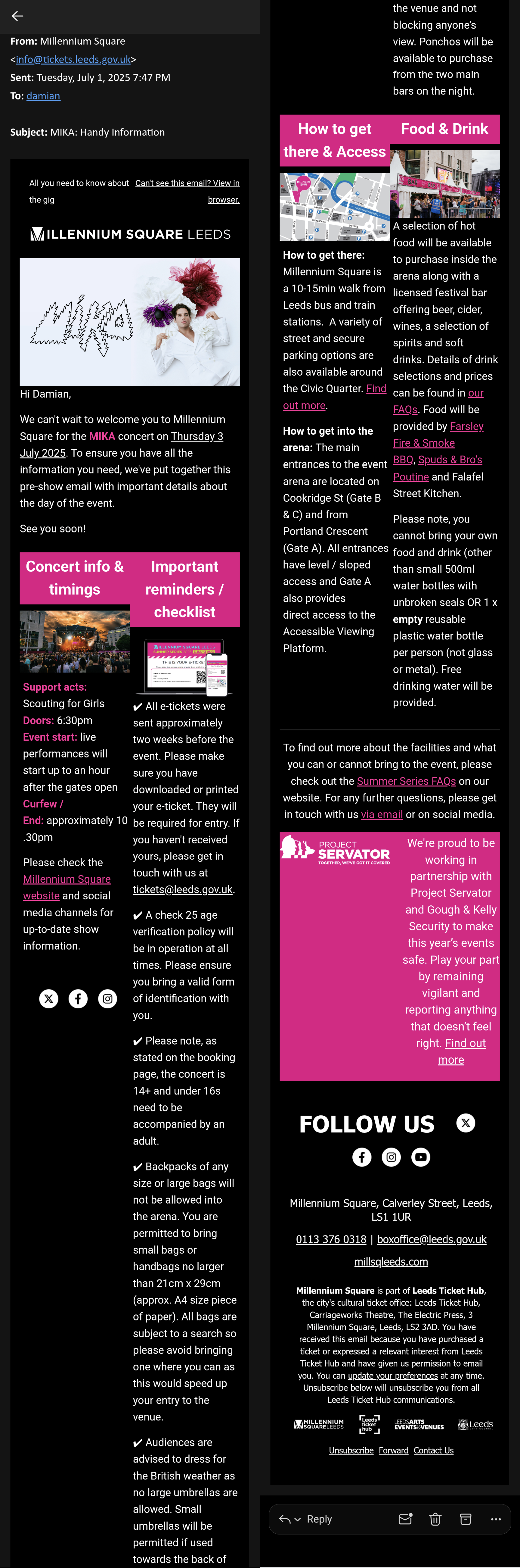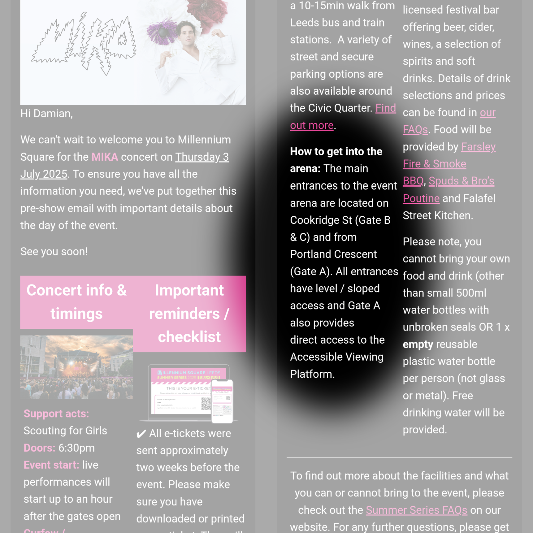 I received my PDF tickets via email, which included a QR code that could be scanned on my mobile device or printed out. I also received an email a couple of days before the event with additional information about the venue, travel arrangements, provisional show times, catering facilities, bag restrictions, and other details.