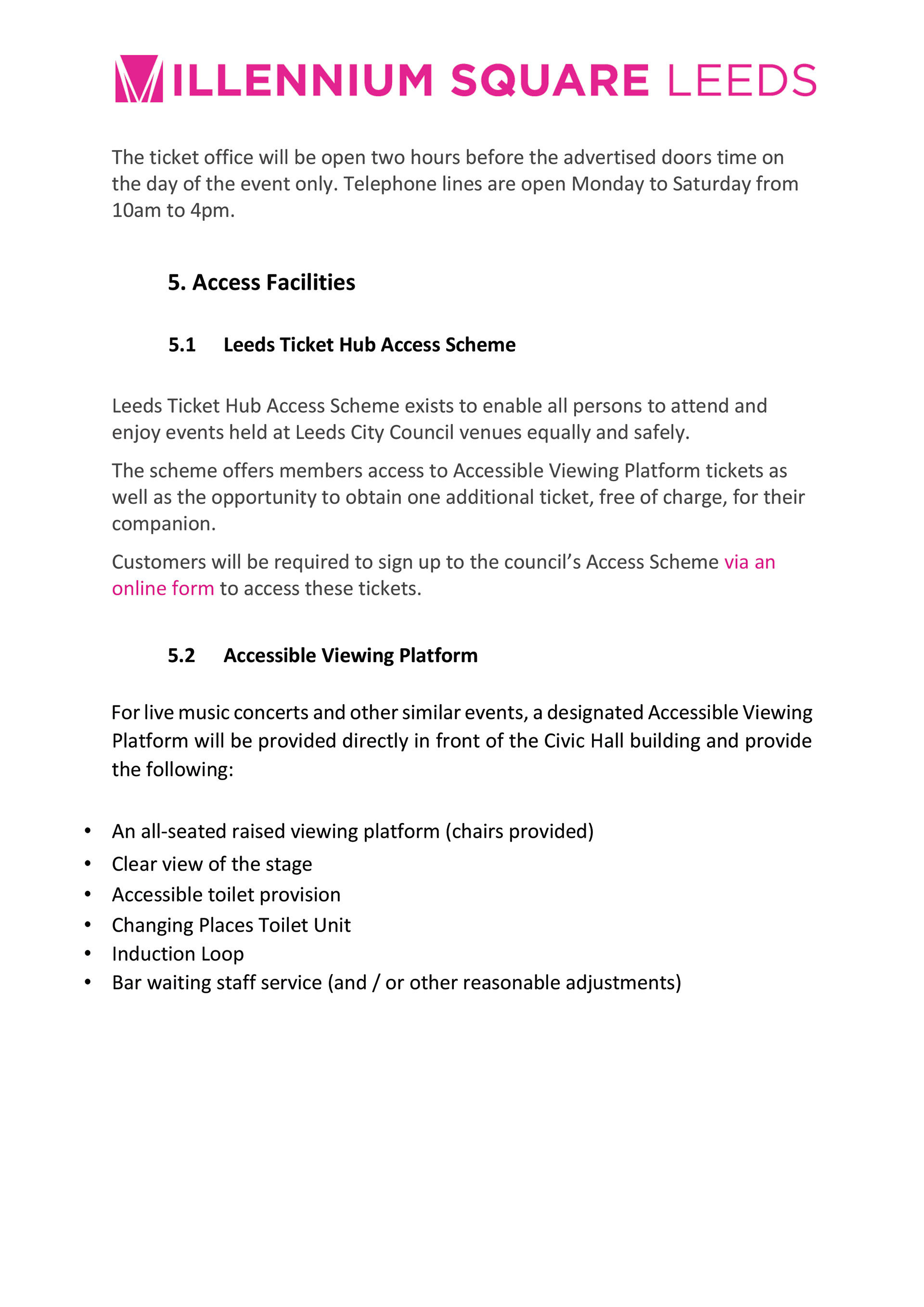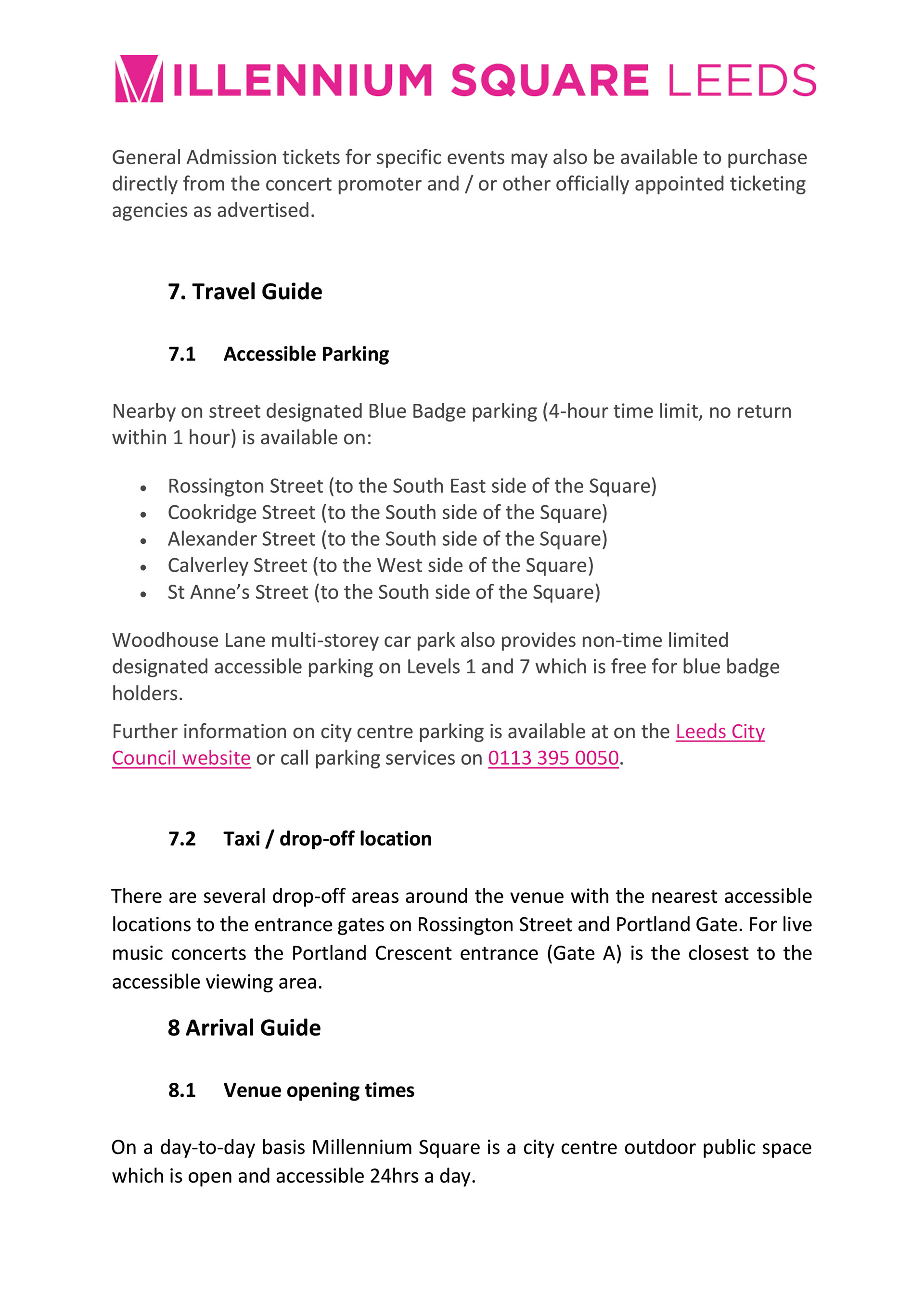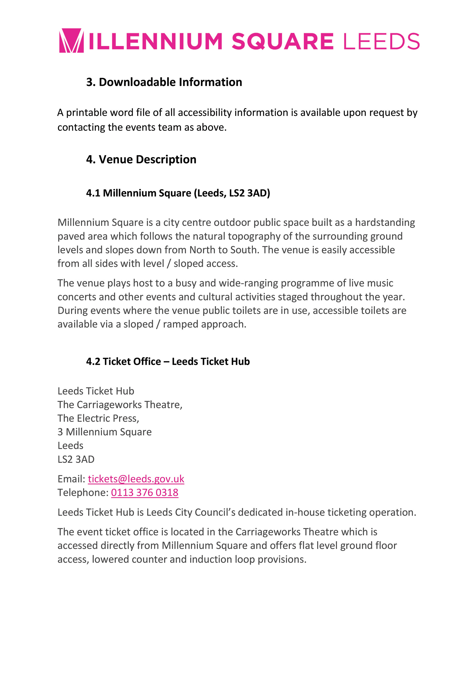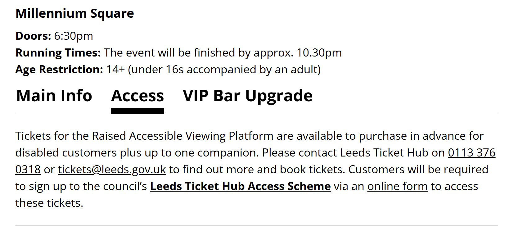 Leeds Ticket Hub handles accessible bookings for events at Millennium Square. The Hub is a central system run by Leeds City Council for booking arts, events, and venues across Leeds.