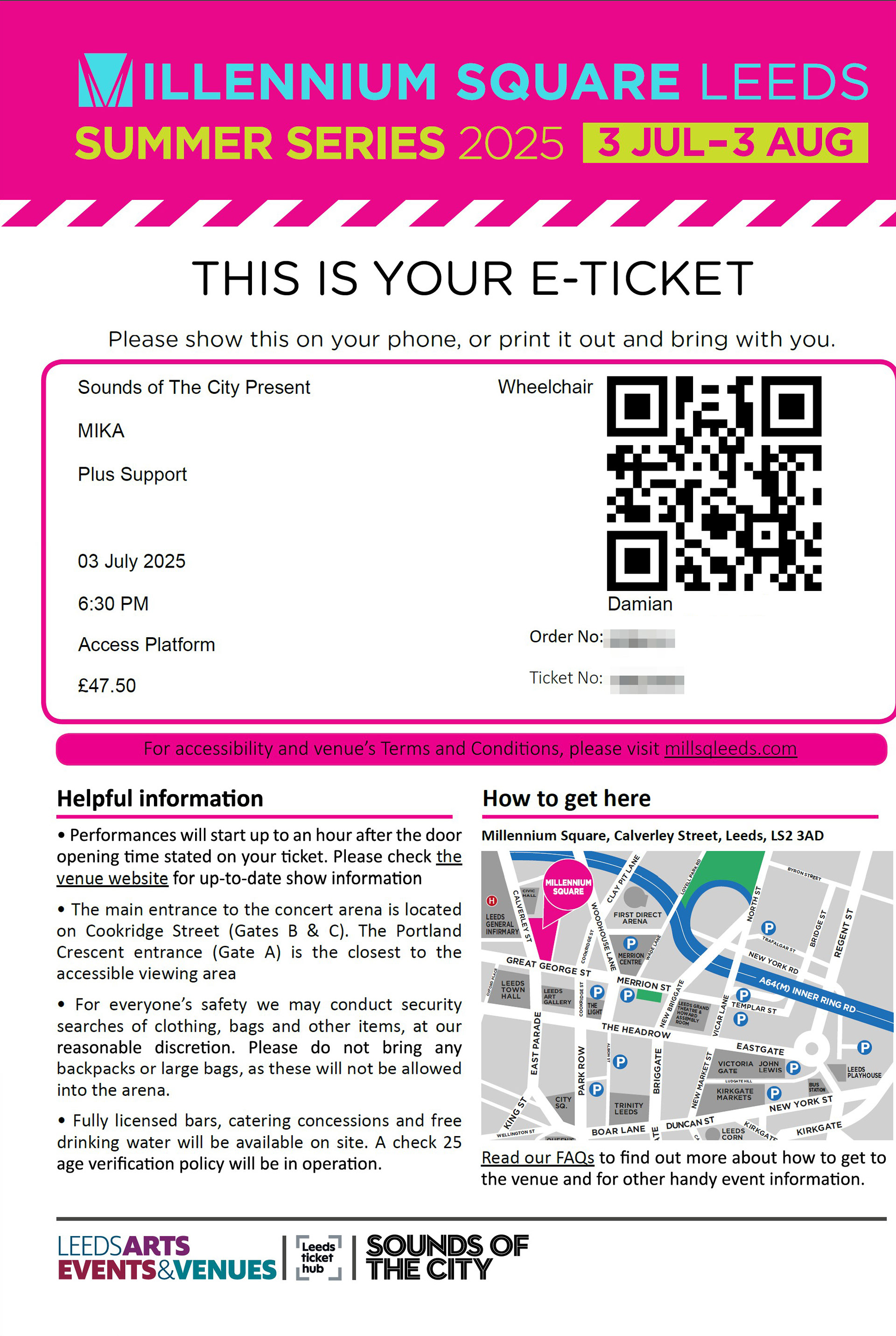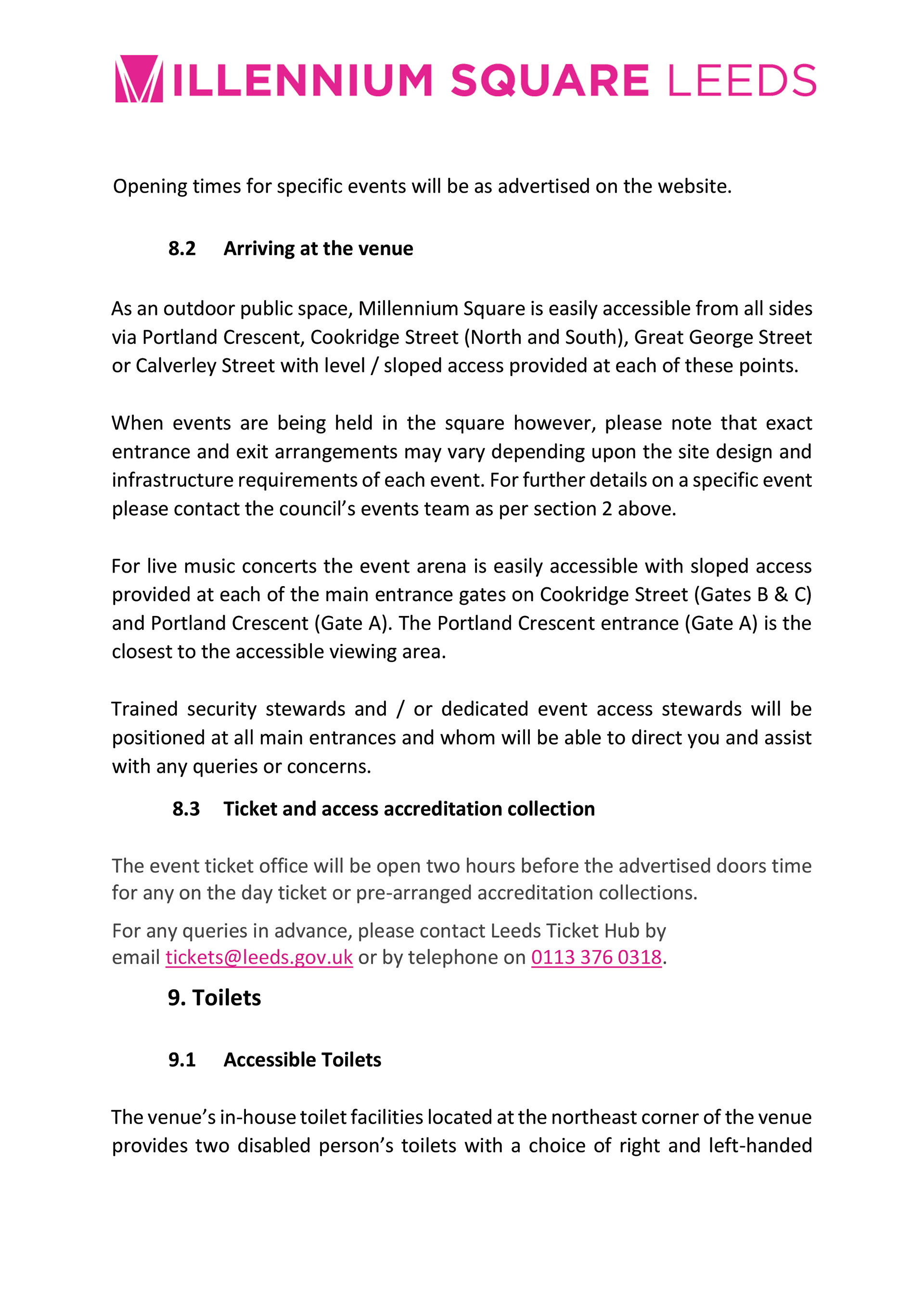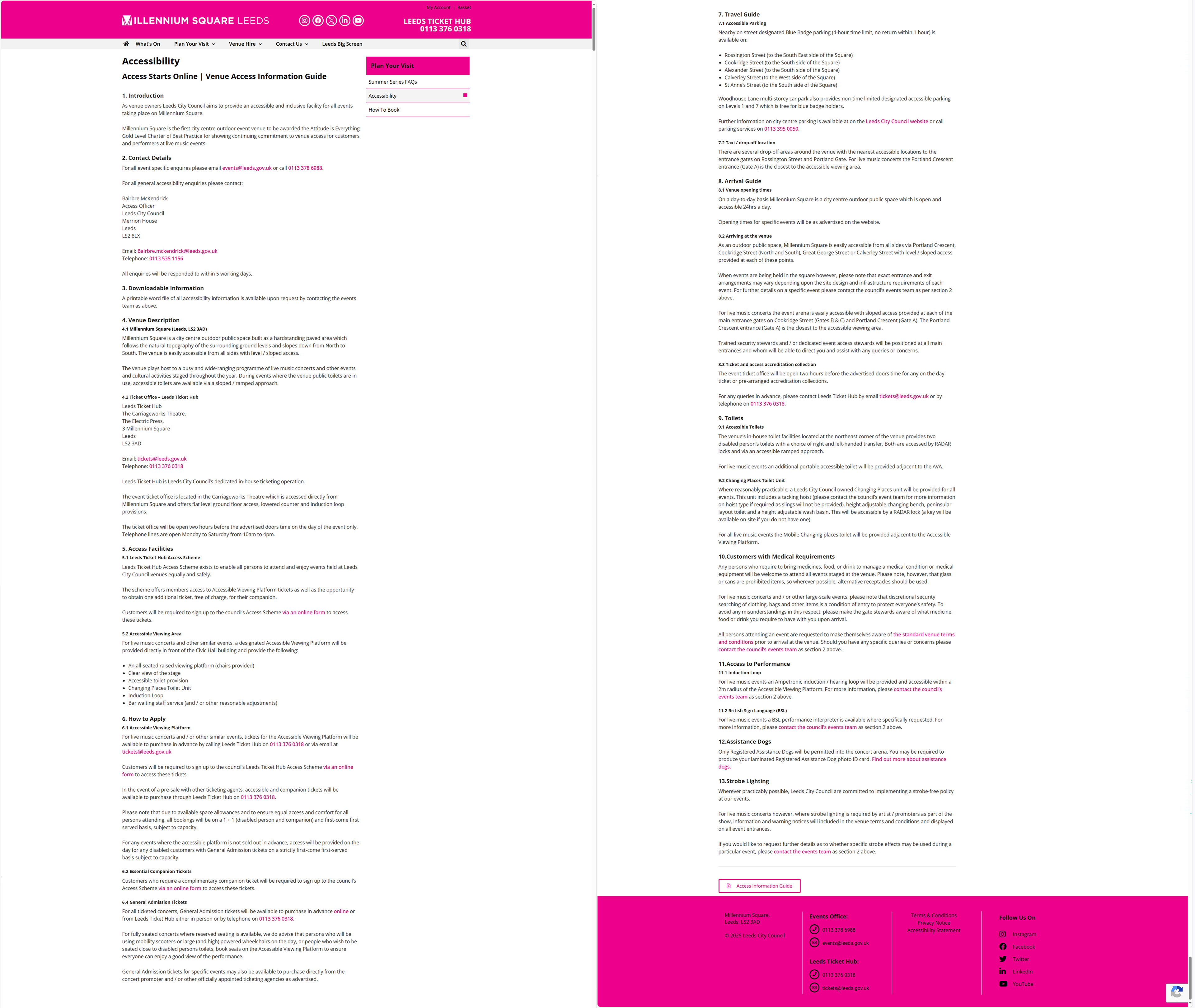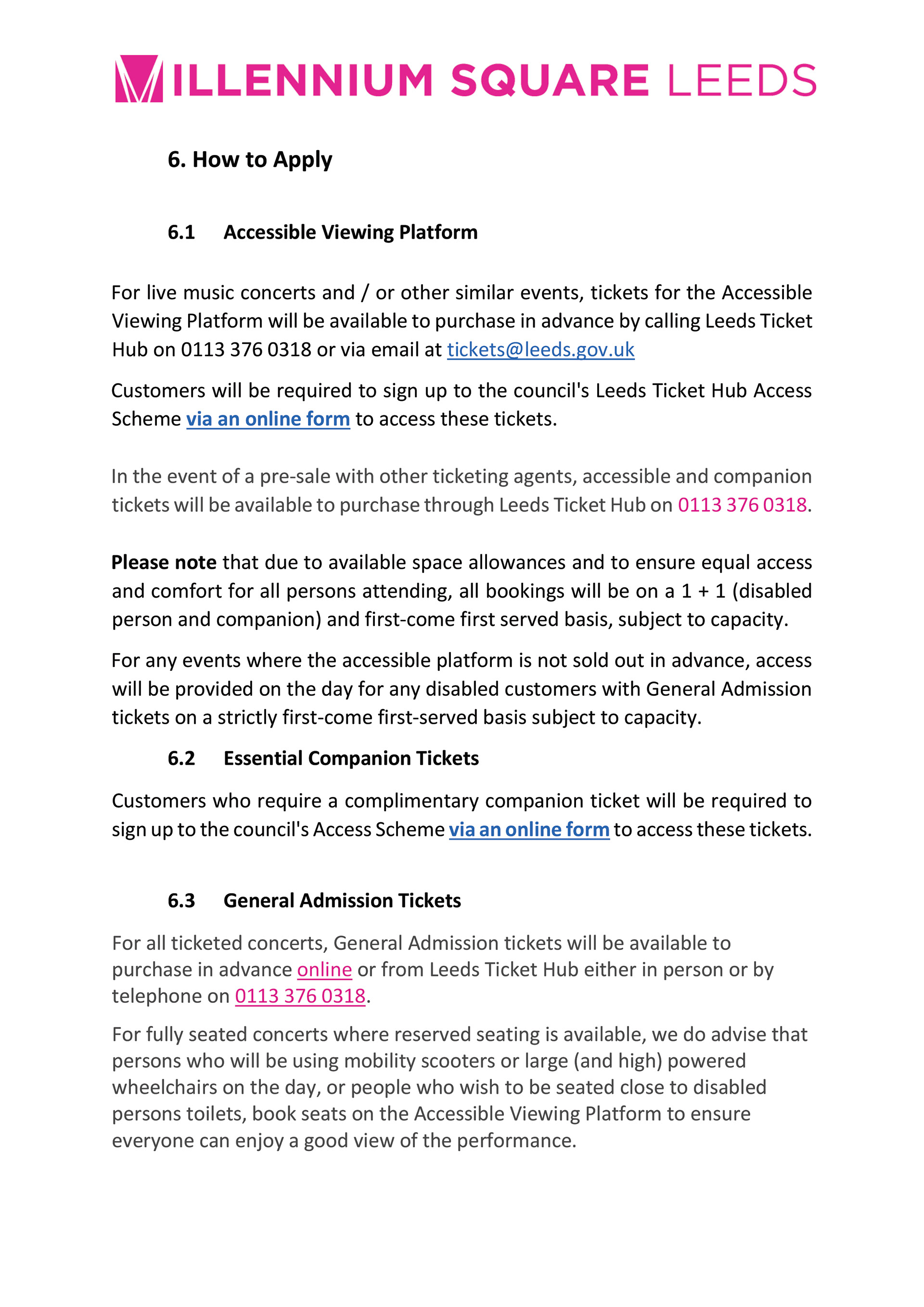 Leeds Ticket Hub handles accessible bookings for events at Millennium Square. The Hub is a central system run by Leeds City Council for booking arts, events, and venues across Leeds.