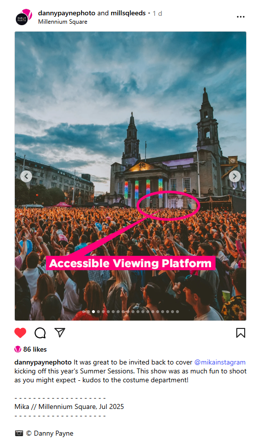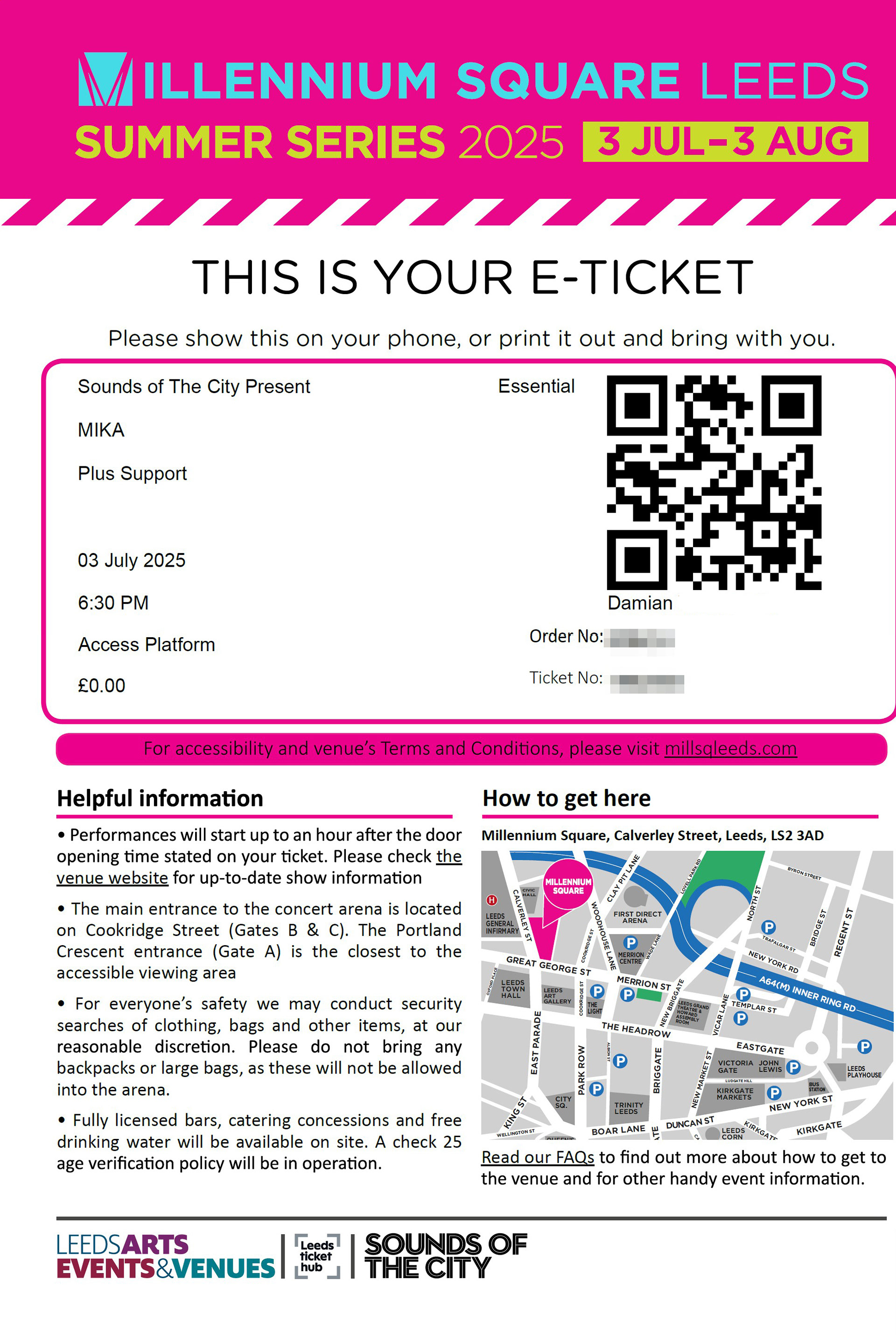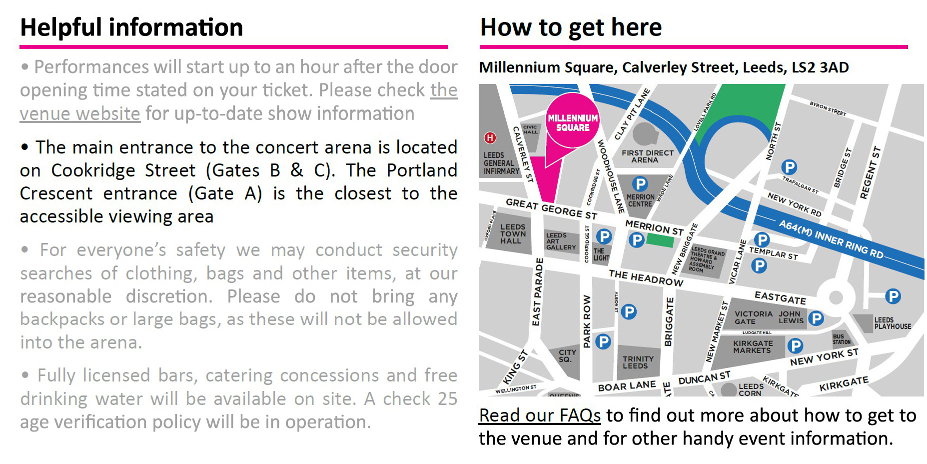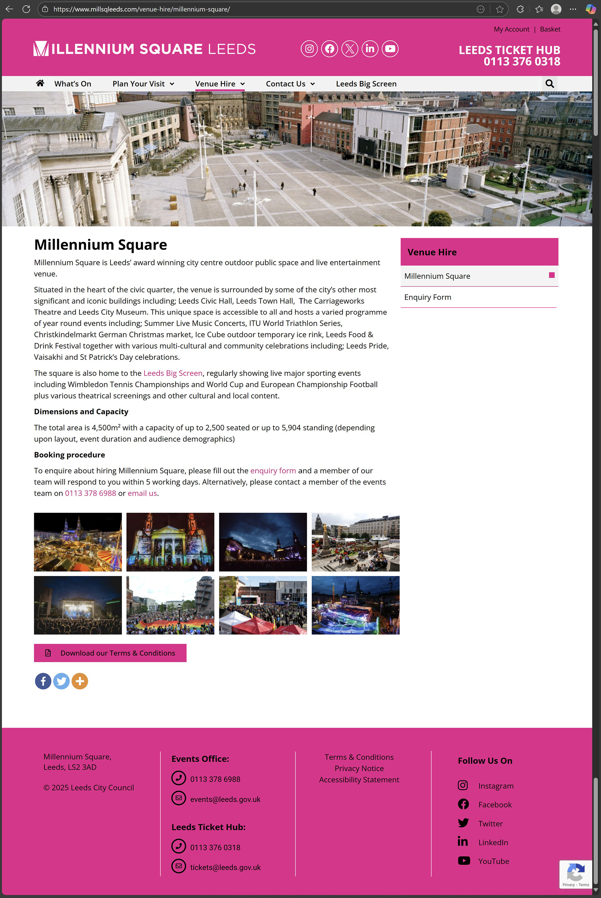 Leeds Ticket Hub handles accessible bookings for events at Millennium Square. The Hub is a central system run by Leeds City Council for booking arts, events, and venues across Leeds.