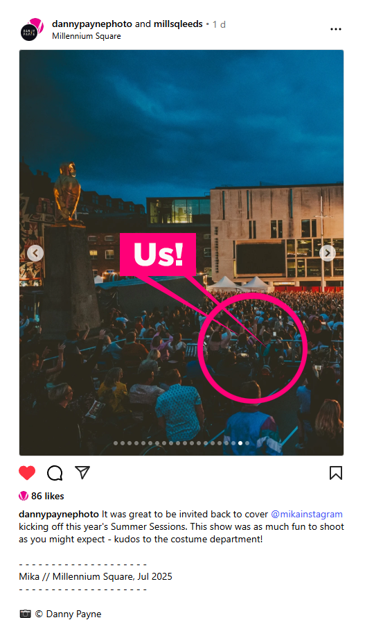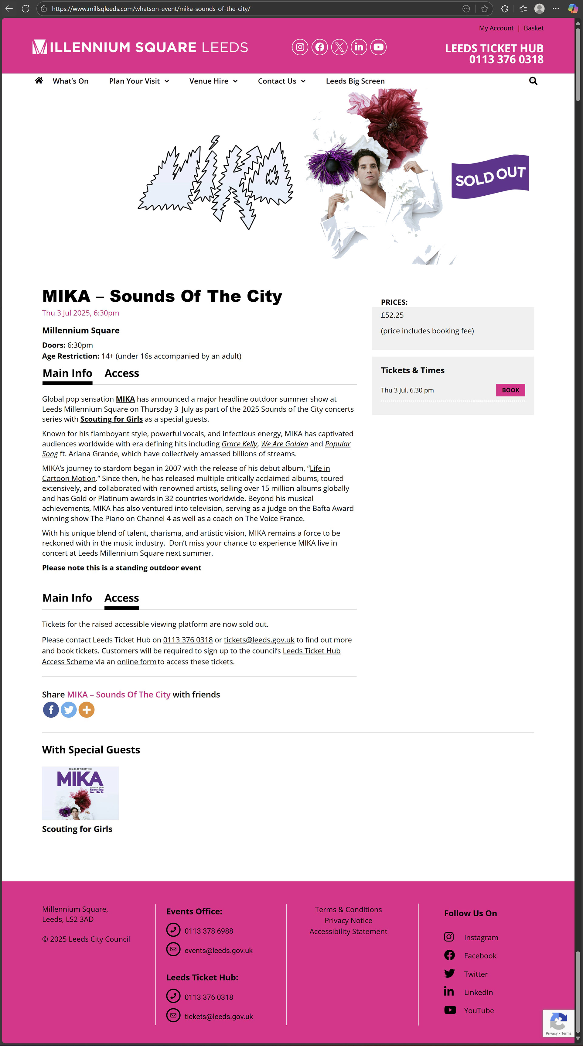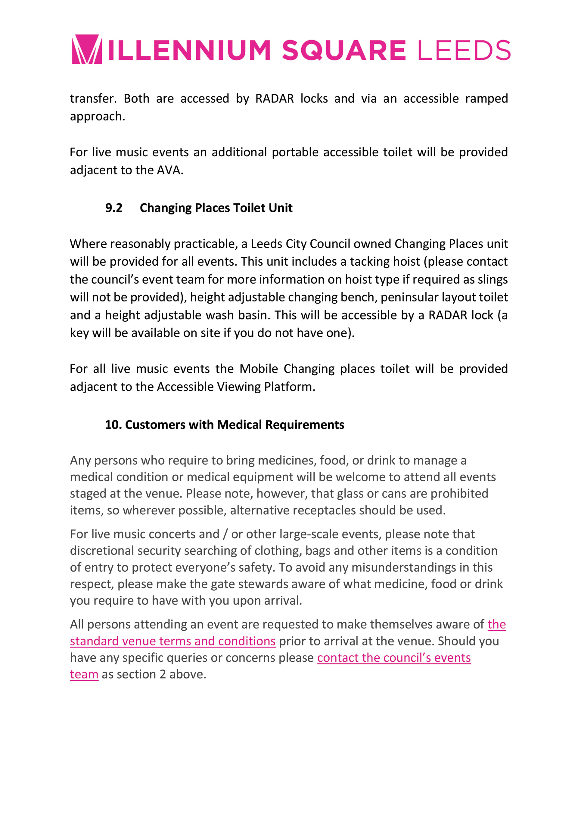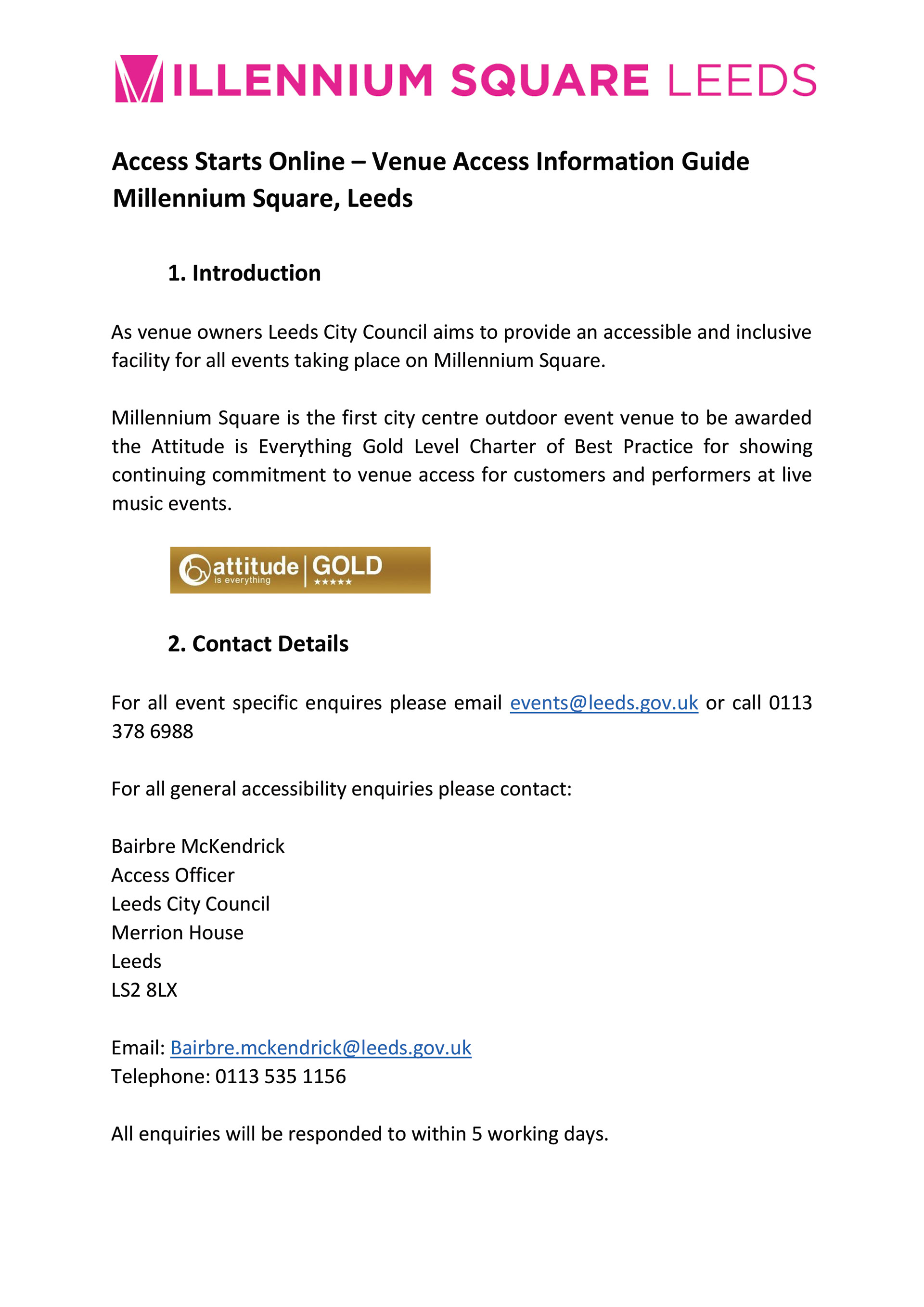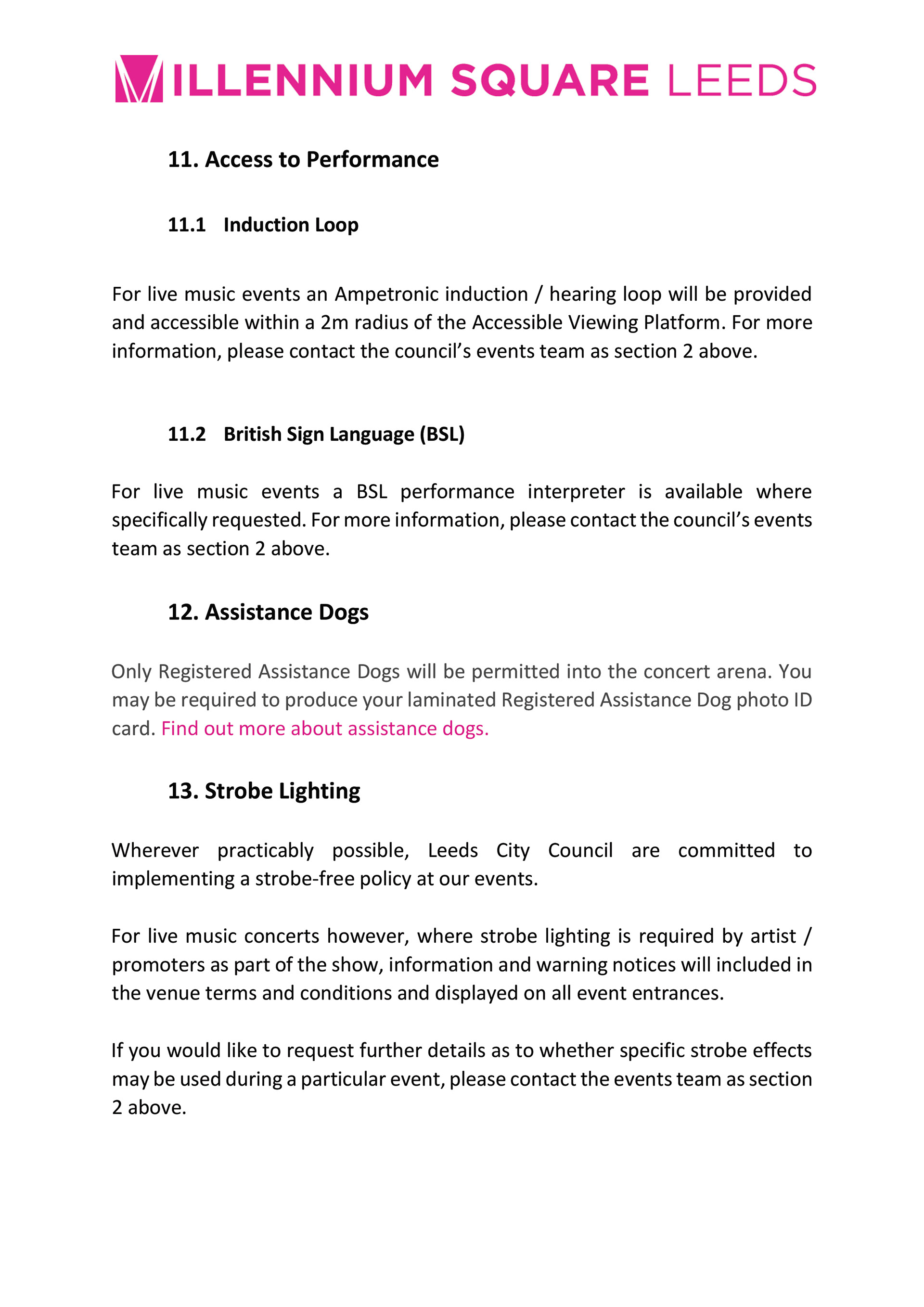 Leeds Ticket Hub handles accessible bookings for events at Millennium Square. The Hub is a central system run by Leeds City Council for booking arts, events, and venues across Leeds.