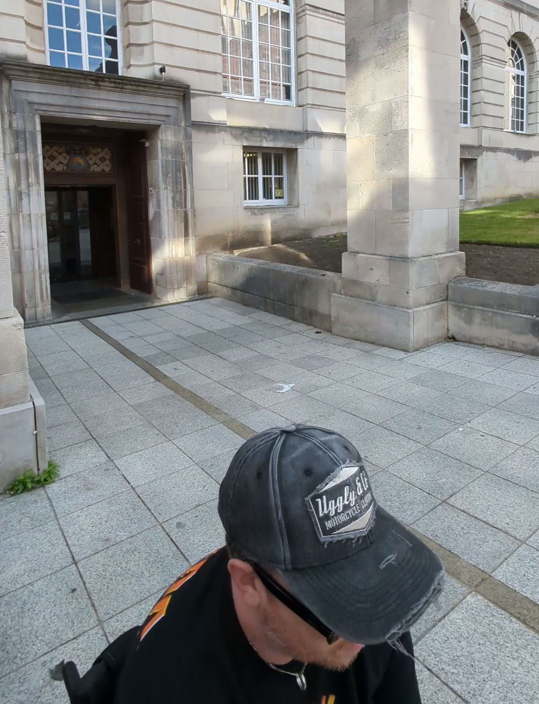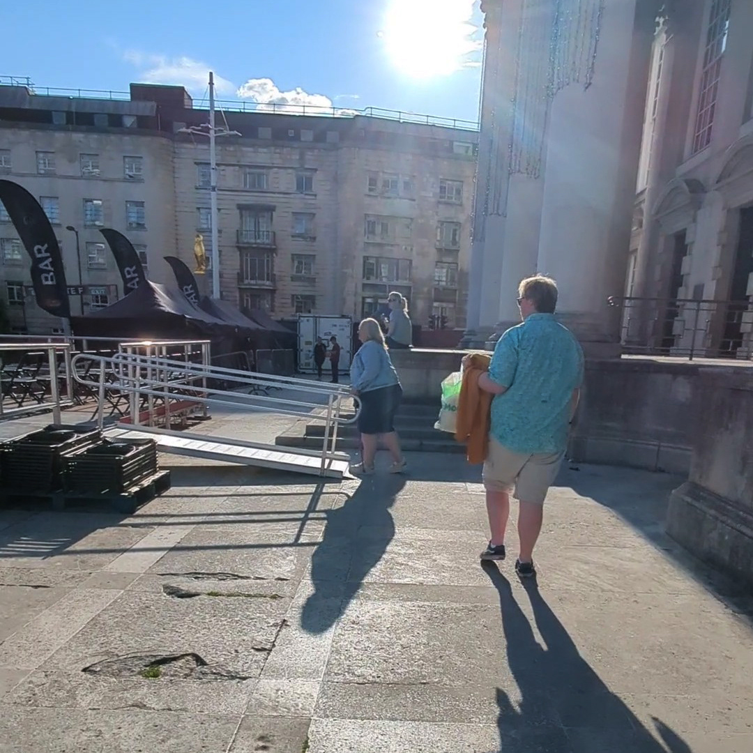The pathway led to the left, around the front of the Town Hall. The path was relatively level. There are steps leading up to the Town Hall. In front of these steps is a level area, followed by an additional three shallow steps. Towards the Town Hall, these steps level off to allow you to wheel towards the middle of the Hall entrance. You need to keep to the right to make wheeling easier. The accessible viewing platform is located to your left, built over the remaining steps.