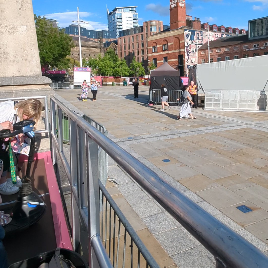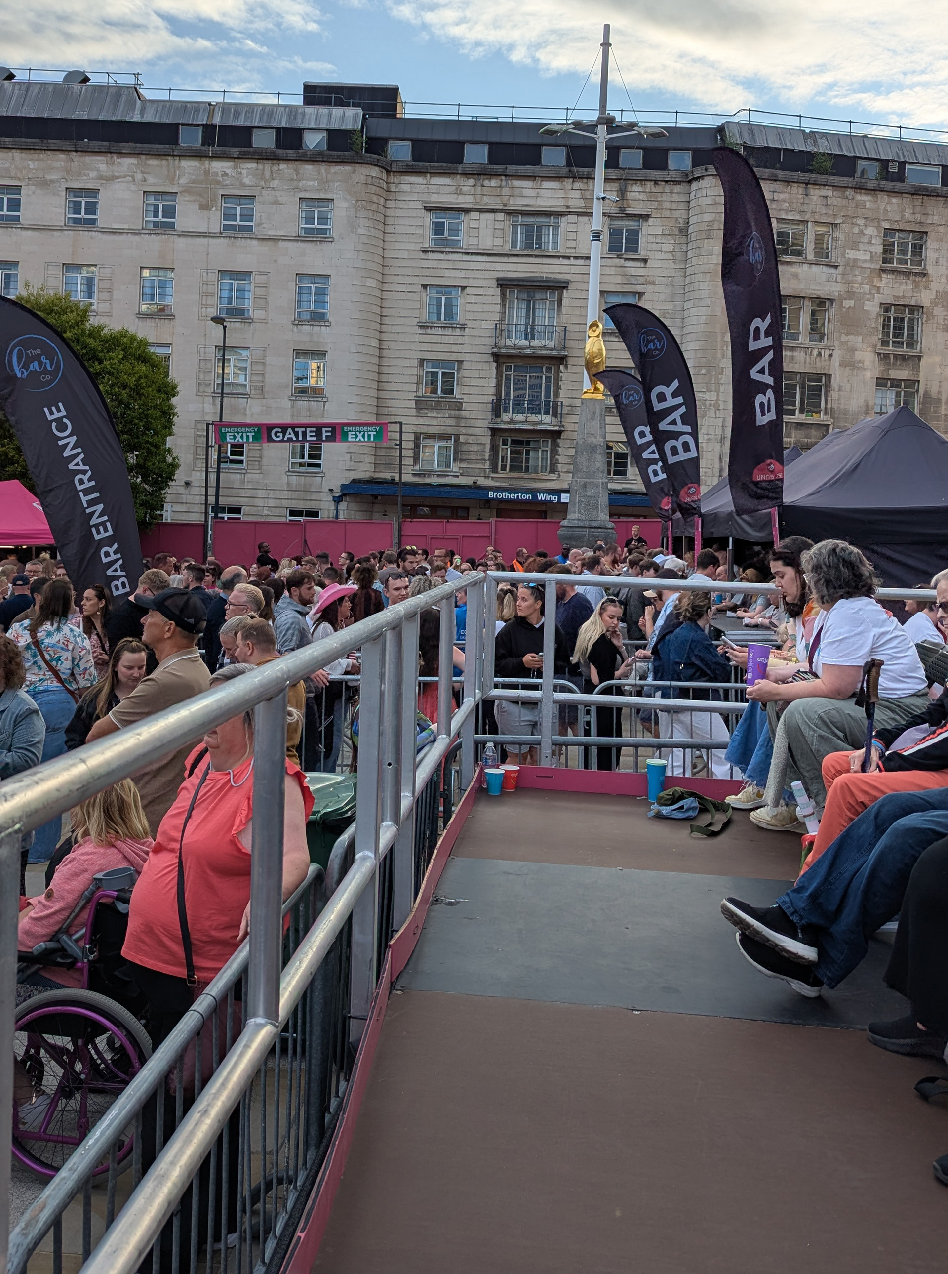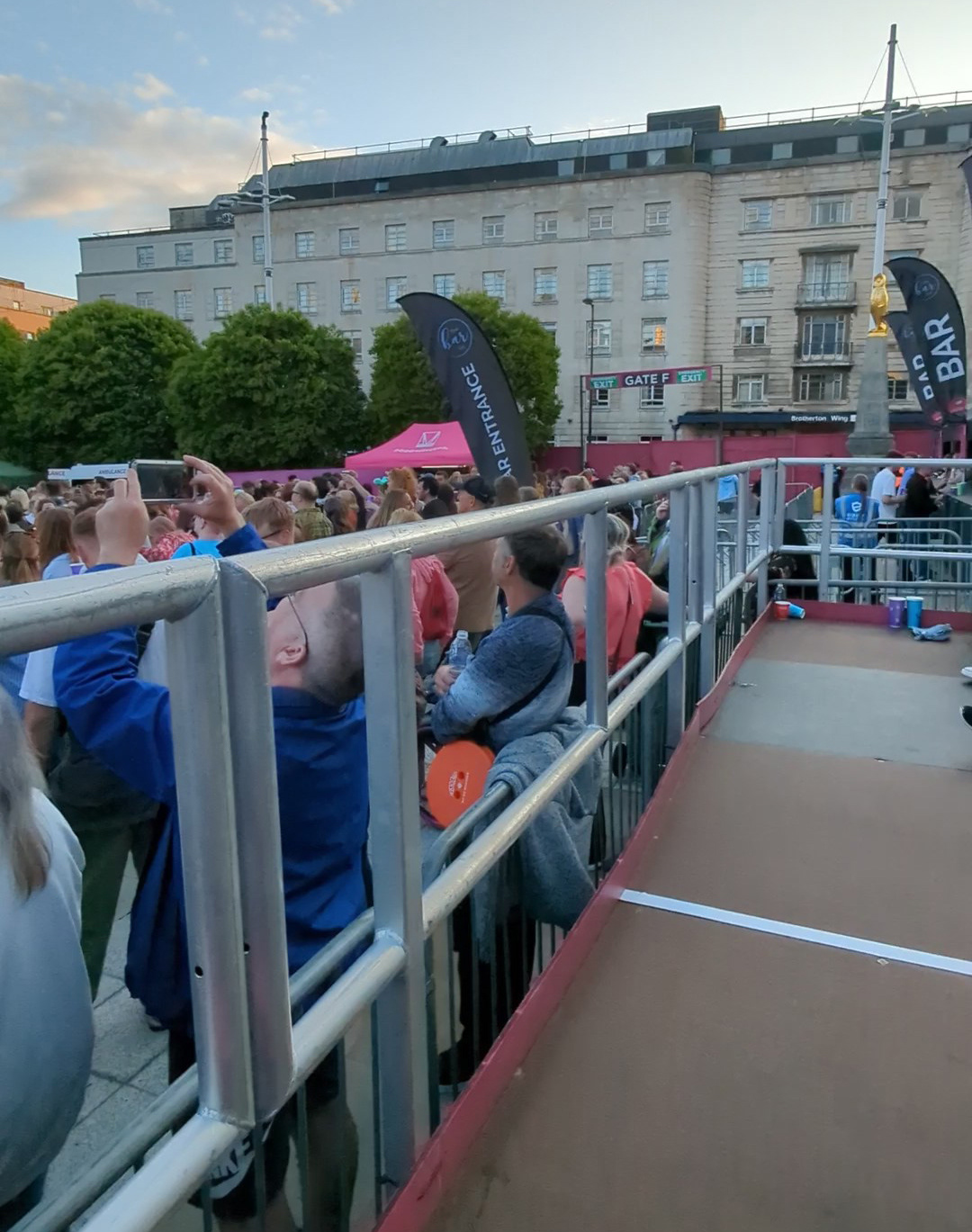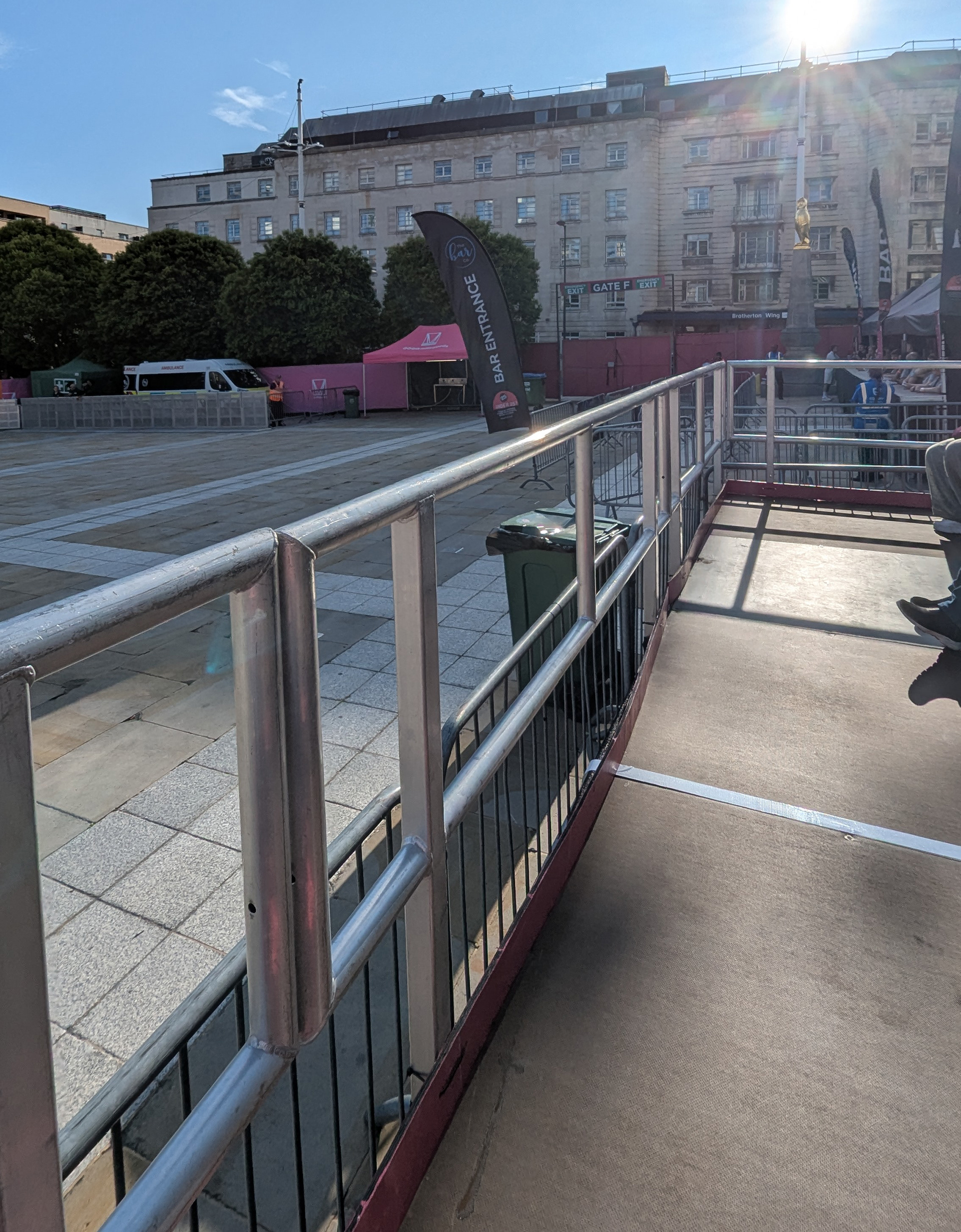 Once the gates were opened, the access queue moved forward, between the large rubbish bin and the wooden fencing. We were given a quick bag check and had our tickets scanned before being directed to the entrance of the accessible viewing platform, located at the back of the square and to our right.