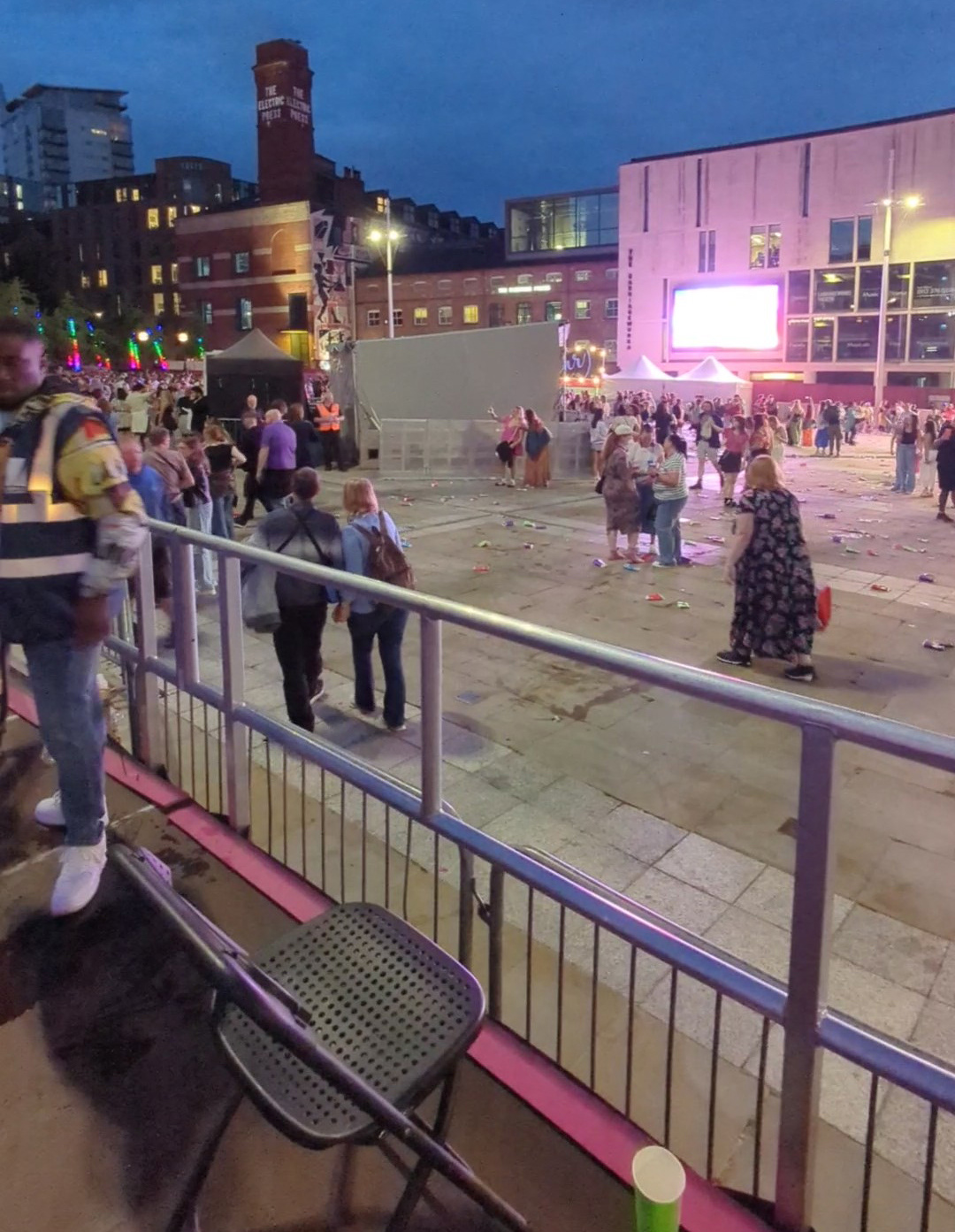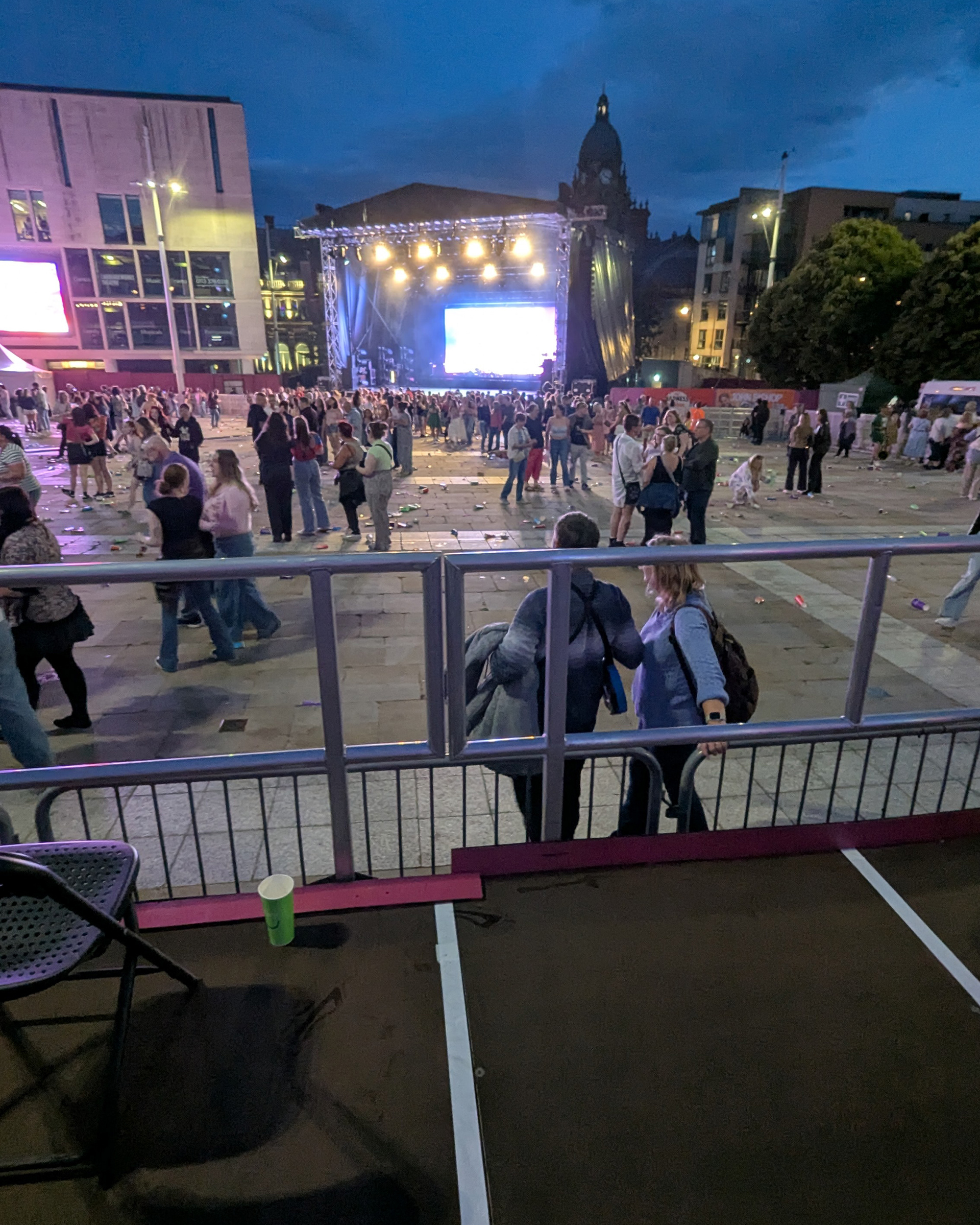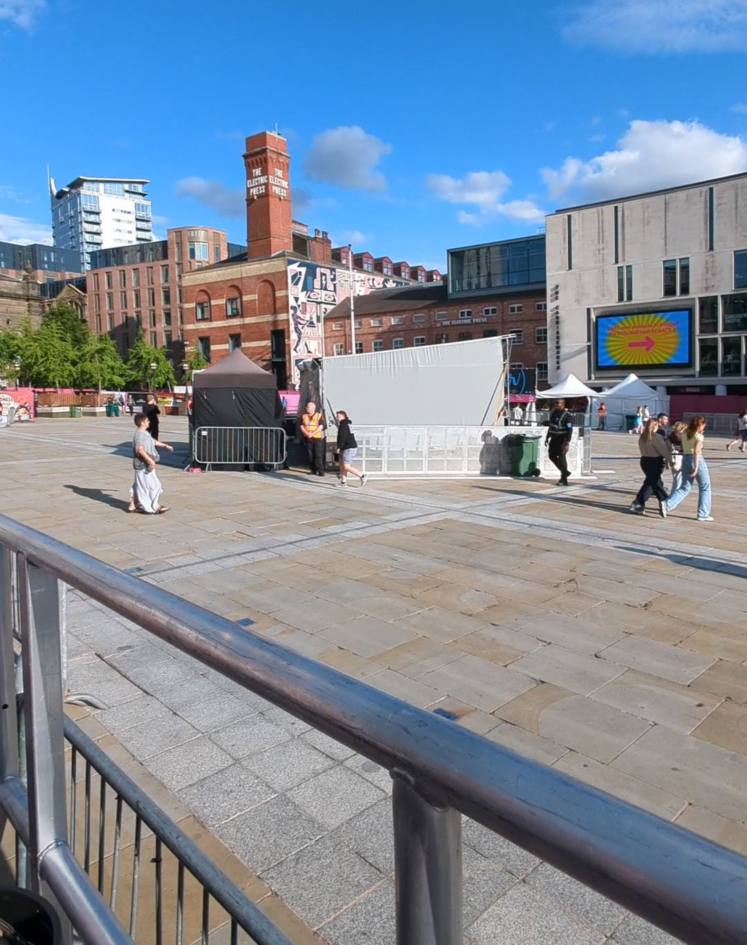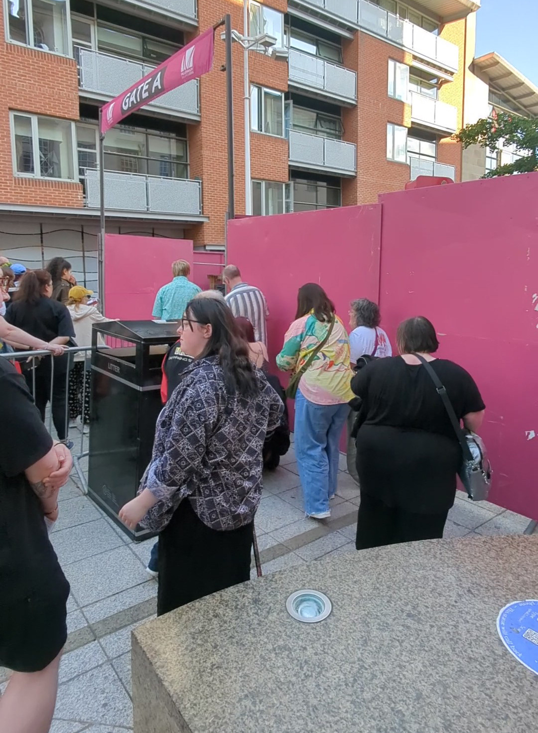 Once the gates were opened, the access queue moved forward, between the large rubbish bin and the wooden fencing. We were given a quick bag check and had our tickets scanned before being directed to the entrance of the accessible viewing platform, located at the back of the square and to our right.