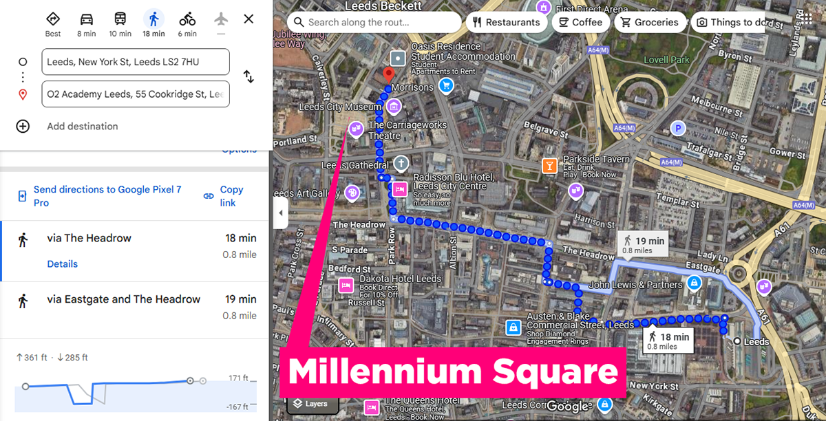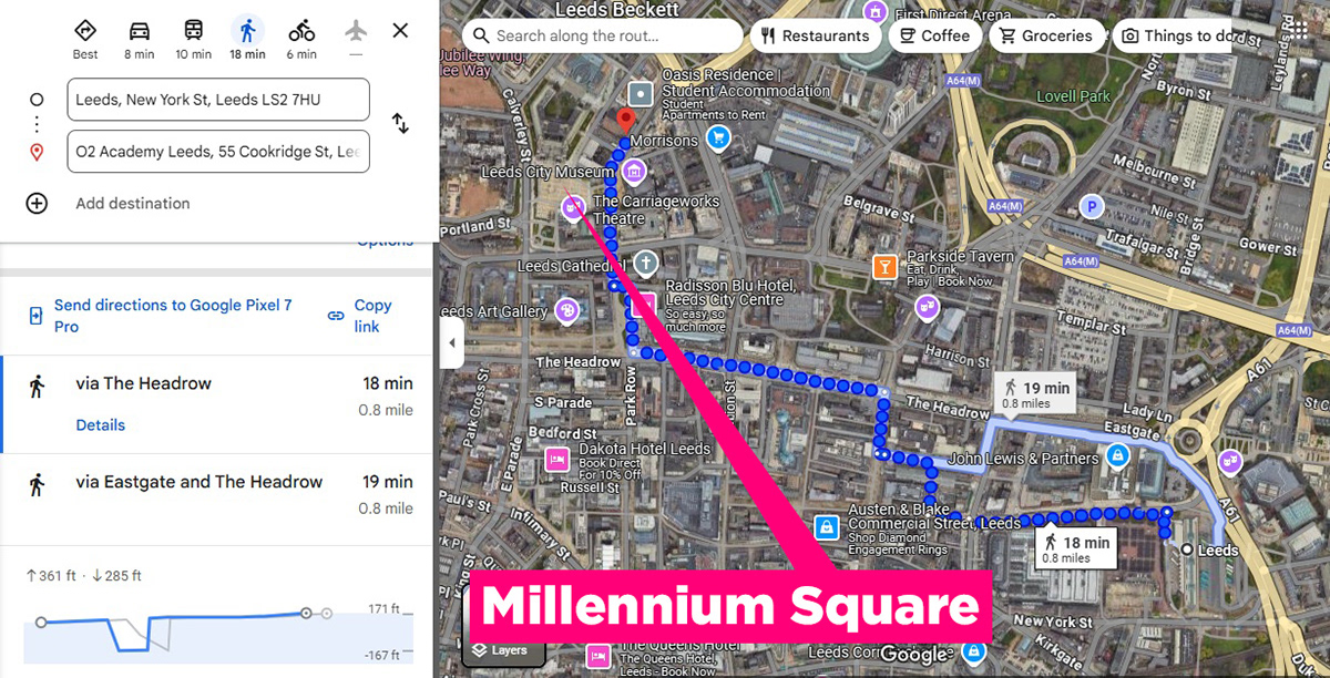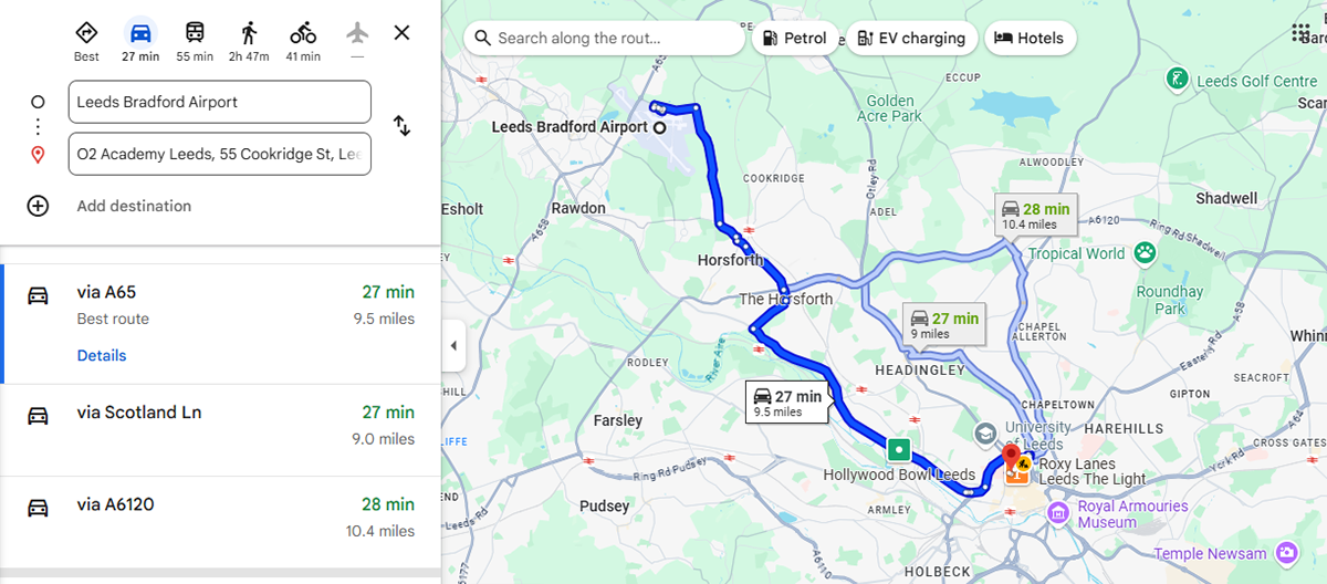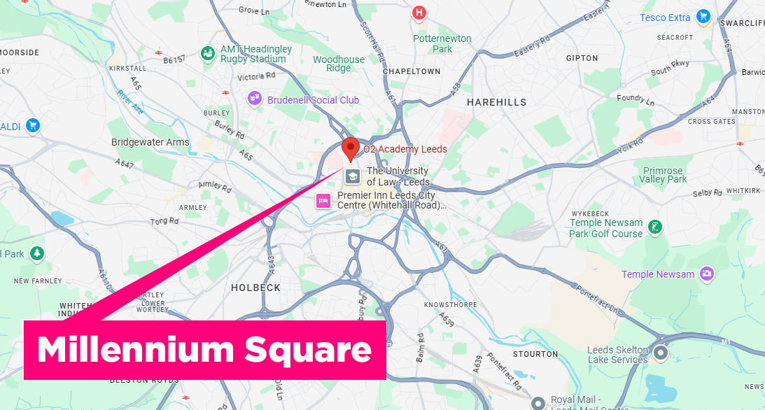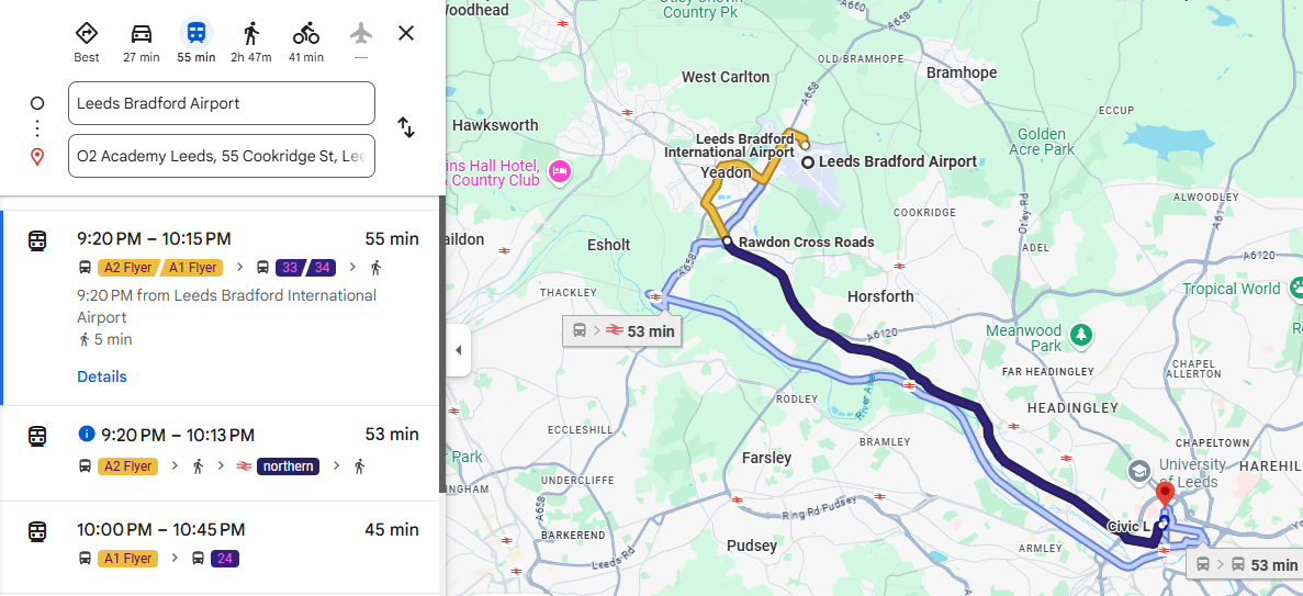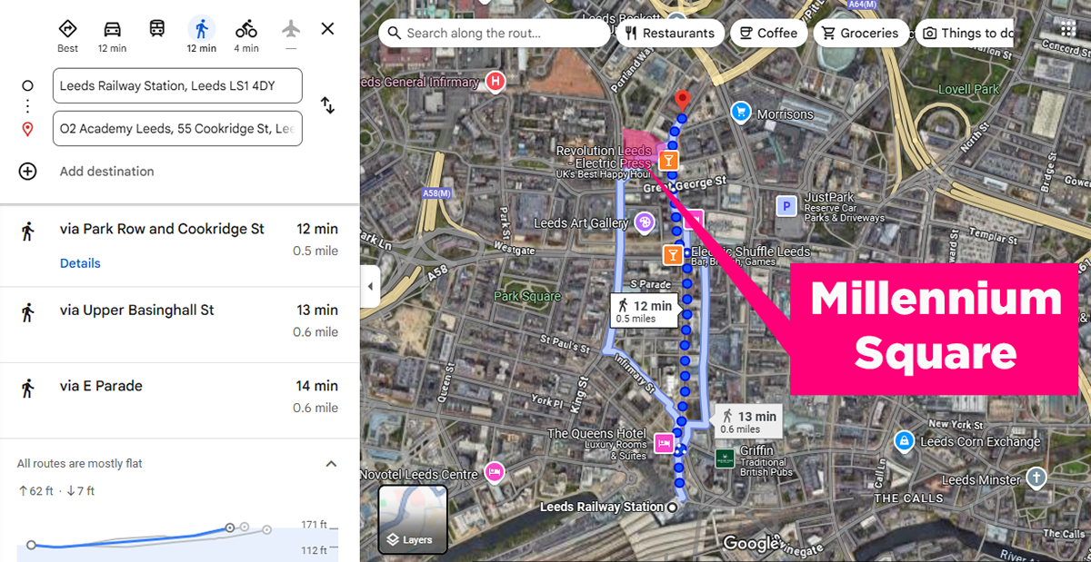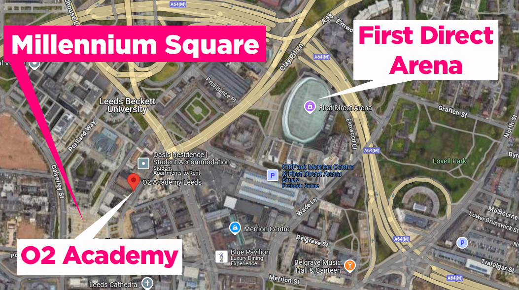 Leeds railway and bus stations are only half a mile and almost a mile away, respectively - it’s not far. However, the city is on a hill, so getting from the stations to the venue is quite a push.