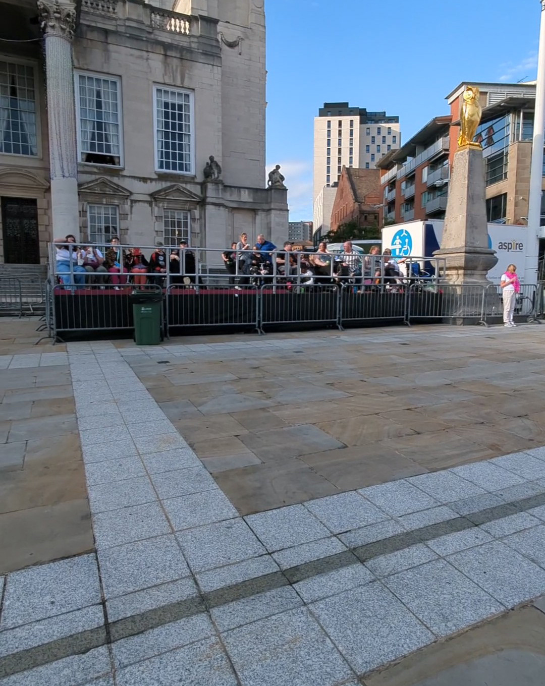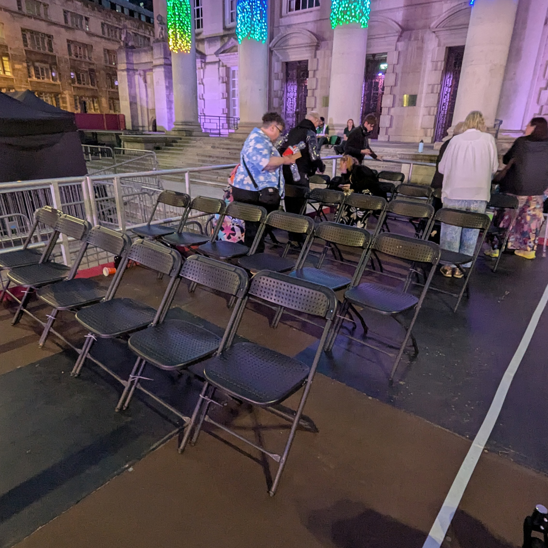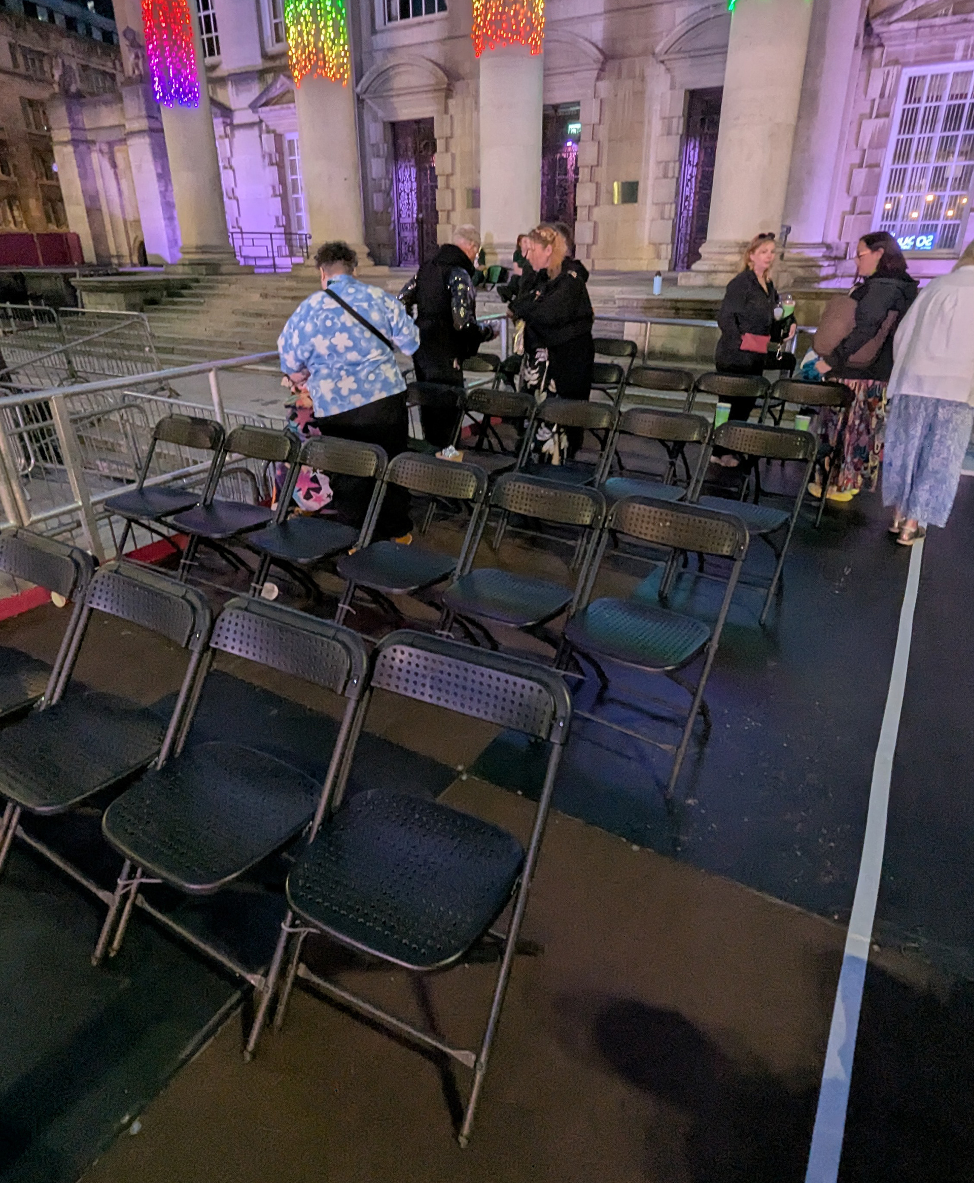 There was no seating available for anyone in the queue, and some ambulatory access customers were using the stonework near the Civic Hall to sit while waiting for the gates to open. Numerous times while we were in the queue, a member of the security staff from the Civic Hall would come out and move people away from the entrance, stating it was an emergency exit that had to be kept clear.