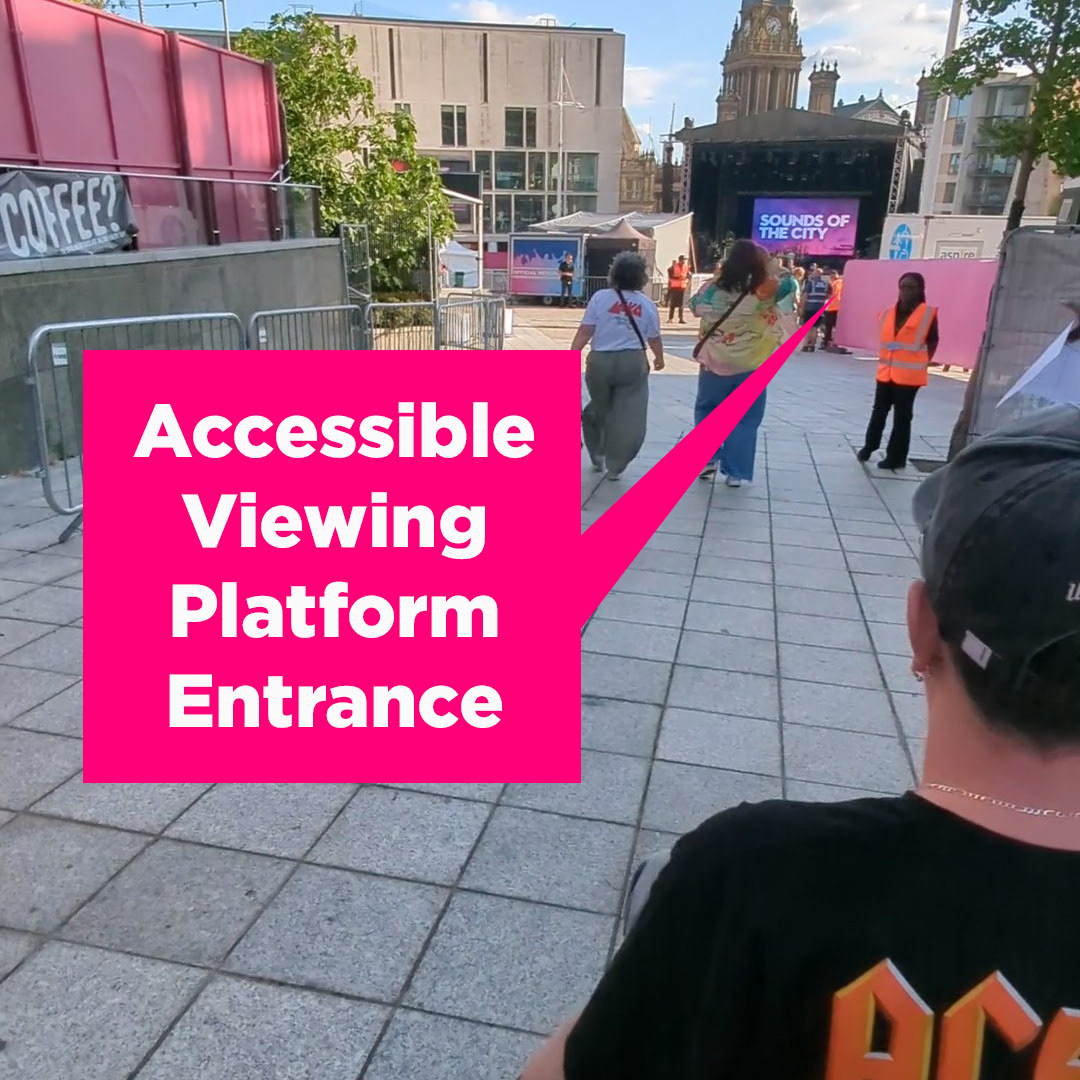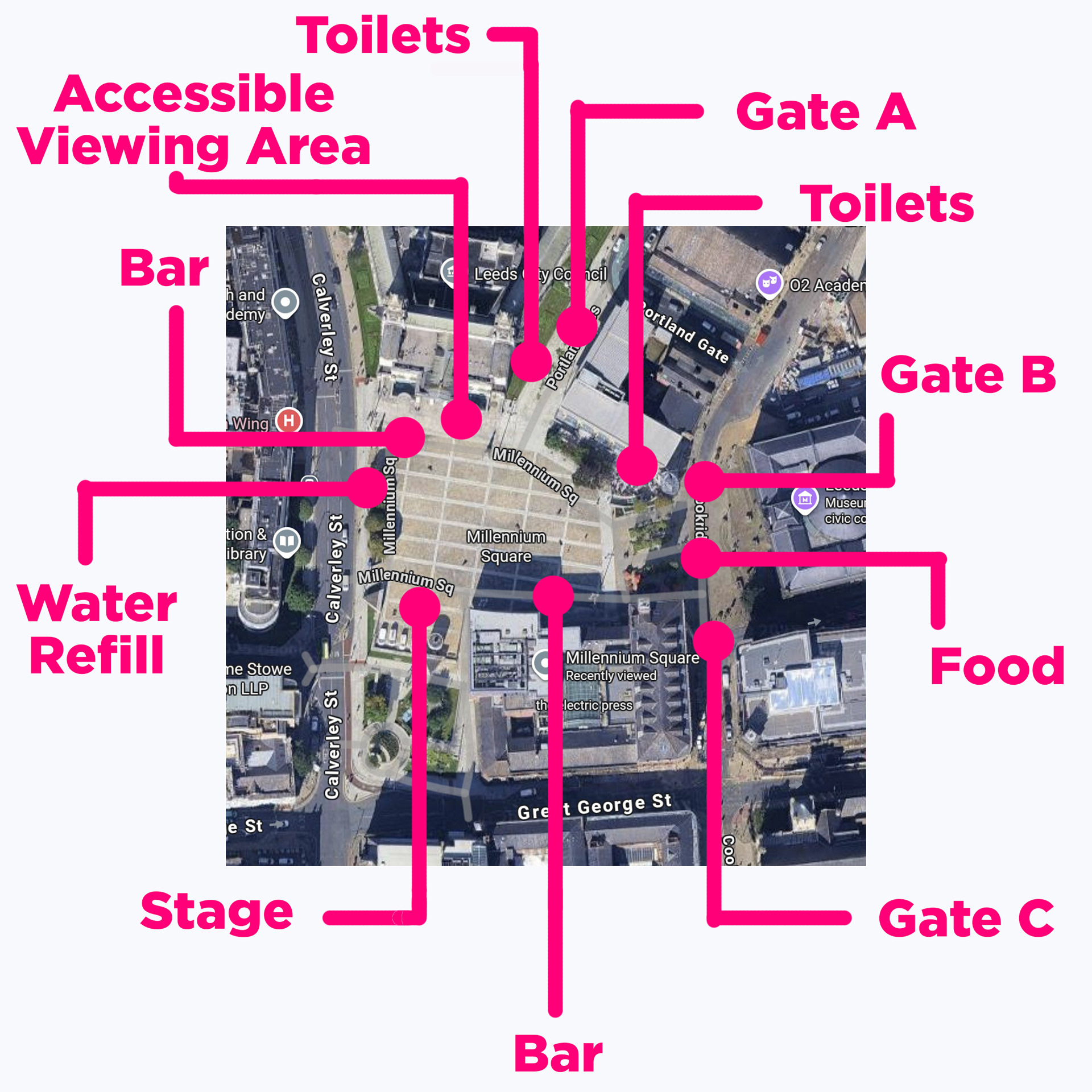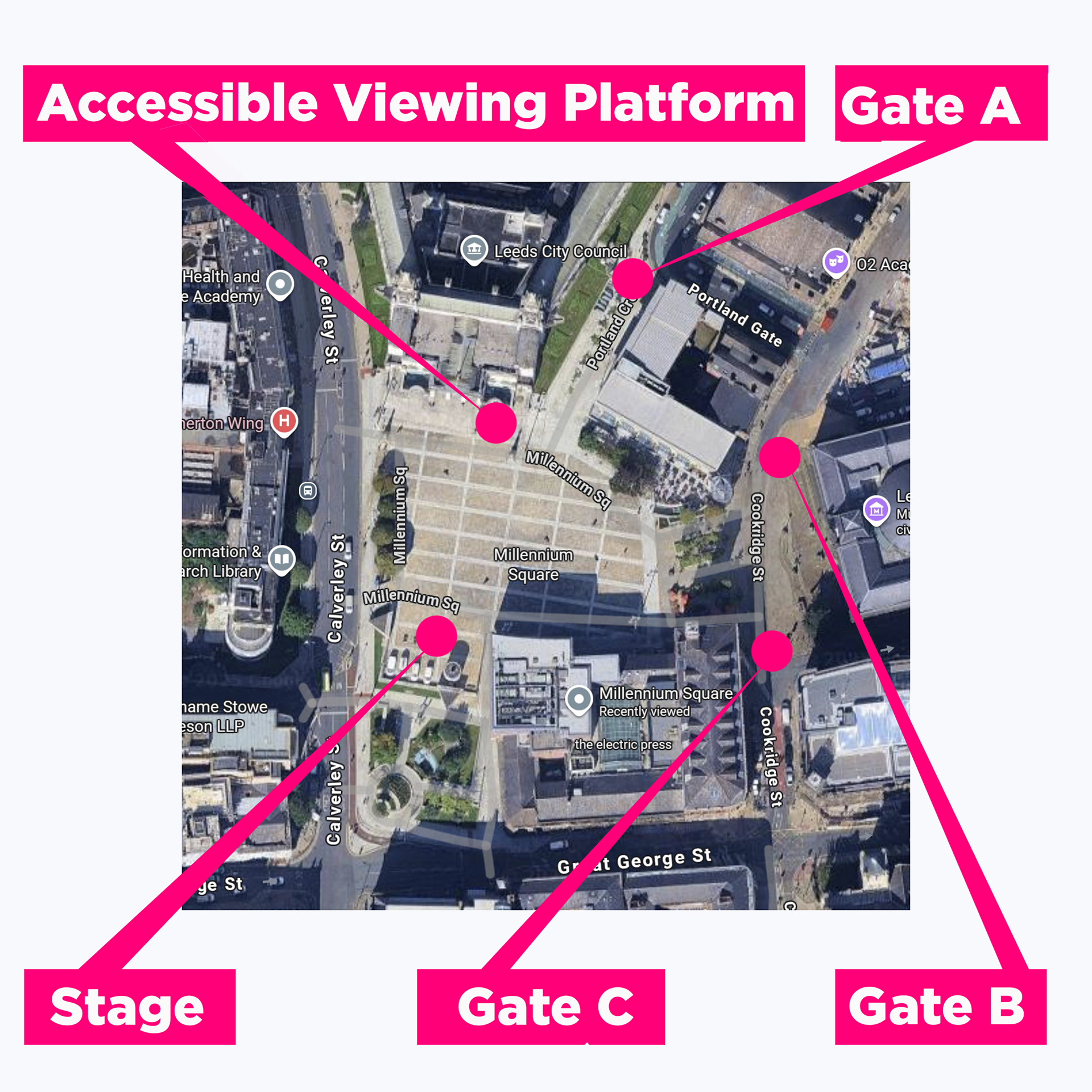 All entrances into the Square are step-free; however, it is recommended that access ticket holders enter via Gate A on Portland Crescent, as this is the closest entrance to the accessible viewing platform. This gate is along the side of the O2 Academy, near to the entrance to the Civic Hall.