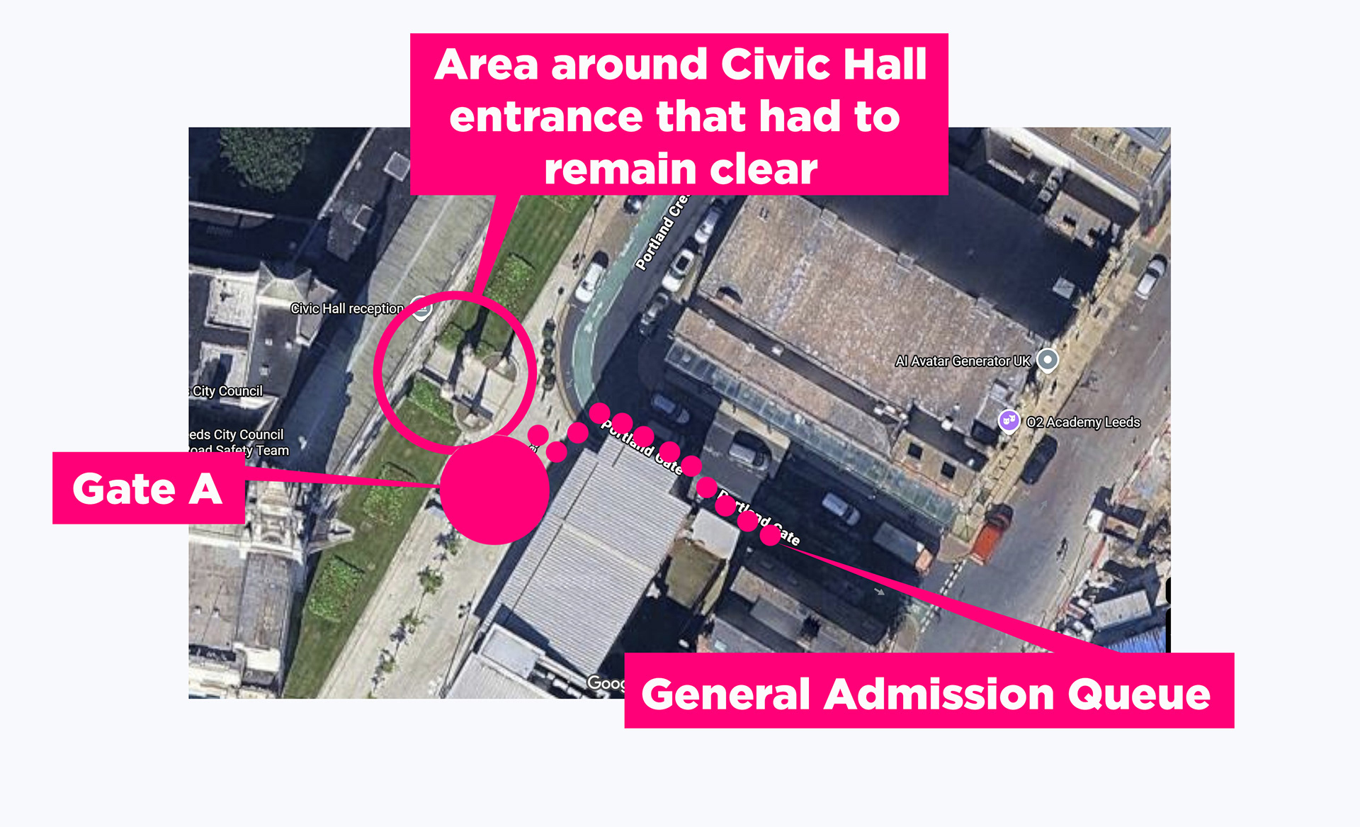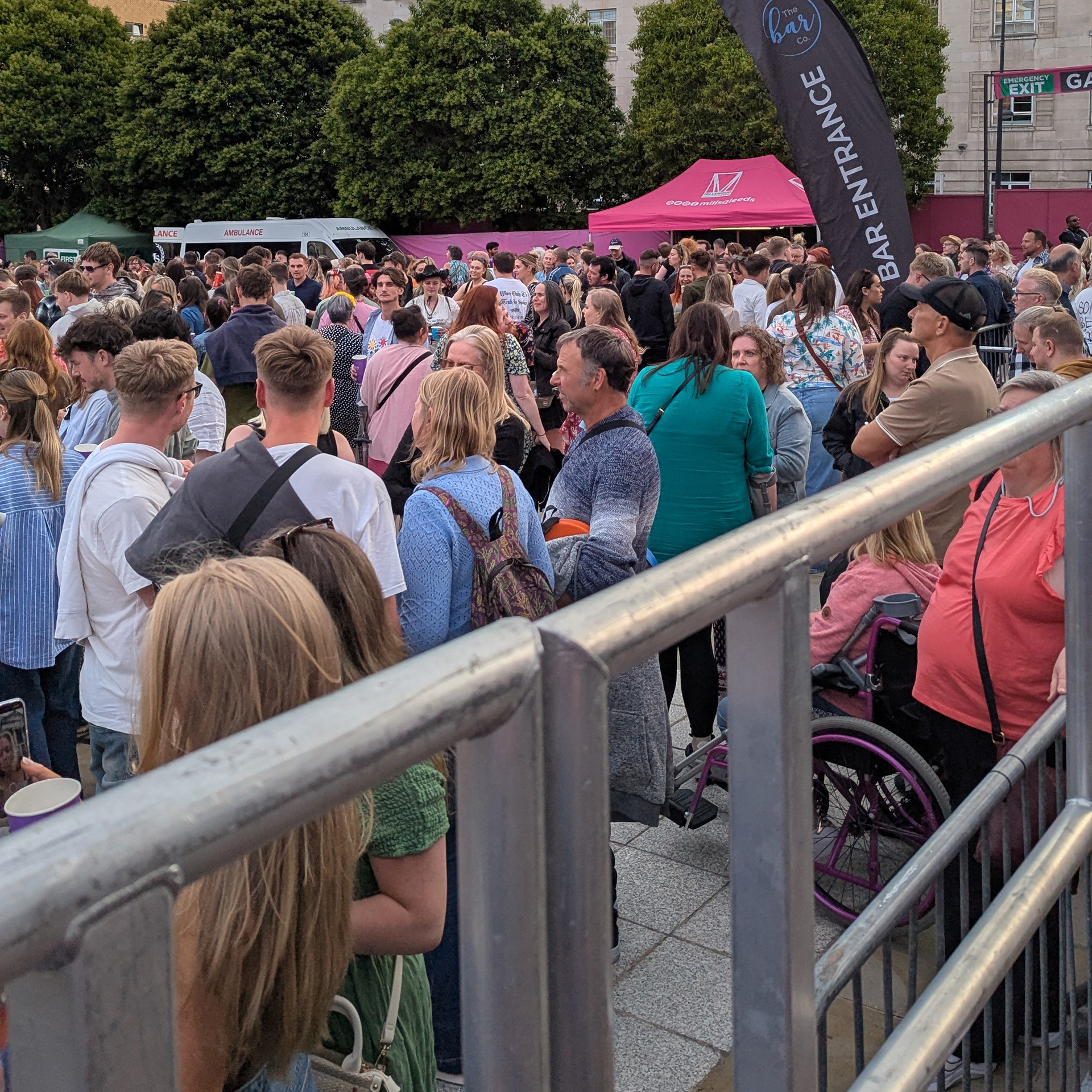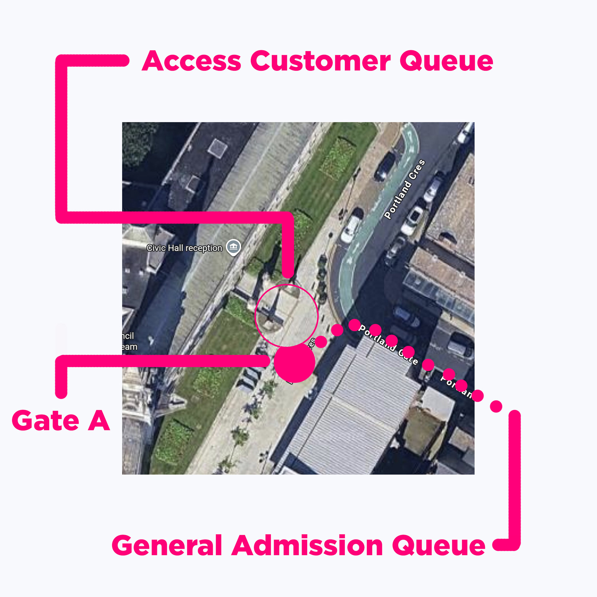All entrances into the Square are step-free; however, it is recommended that access ticket holders enter via Gate A on Portland Crescent, as this is the closest entrance to the accessible viewing platform. This gate is along the side of the O2 Academy, near to the entrance to the Civic Hall.
