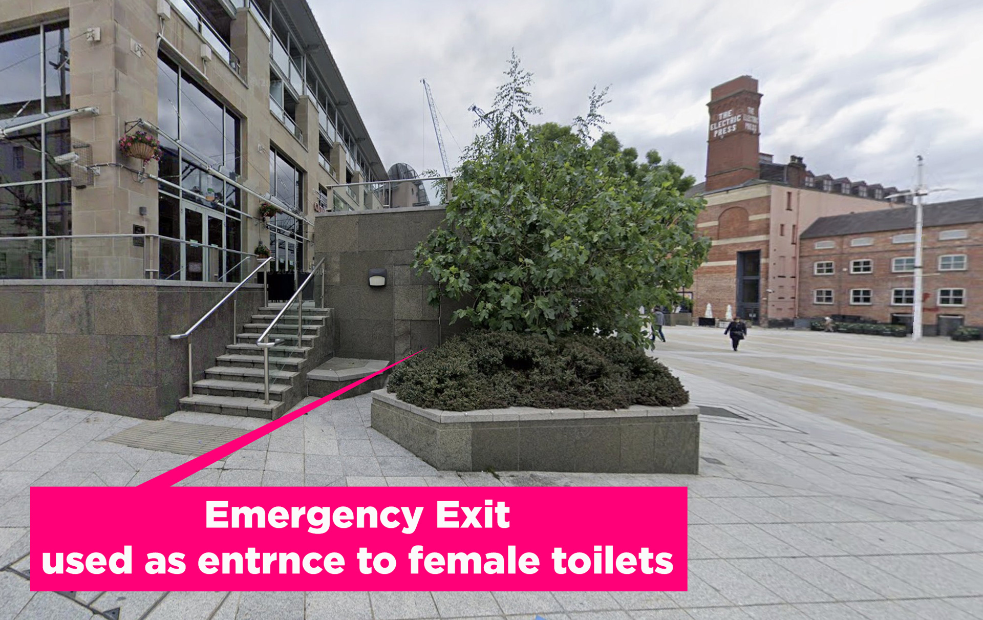 The ladies' toilet entrance was an emergency exit located under the Wetherspoon’s pub, close to the accessible viewing platform, which led downstairs to the opposite end of the public toilets. The stairway is narrow, so queuing was awkward.